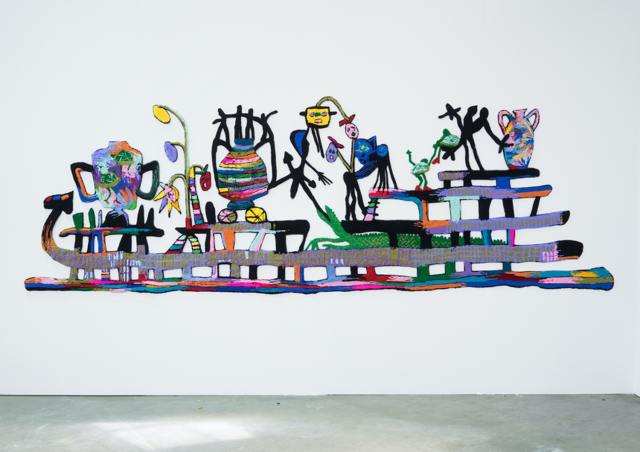 Afra Eisma (1993) maakt talloze kleurrijke sculpturen, wandkleden en keramische werken, die elk geïnspireerd zijn op haar leefwereld. Zowel de tastbare wereld en de mensen om haar heen, als haar innerlijke fantasiewereld. Het openlijk delen van deze persoonlijke verhalen en elementen ziet zij als een belangrijke tegenbeweging in een wereld waarin we onszelf veelal terugtrekken en afsluiten in hokjes. Op Unfair toont ze een nieuw wandkleed vol gekleurde figuren en verhalen, en een bank waarop je kunt zitten tussen armen, benen en hoofden van fantasiewezens van textiel. Hier kan je letterlijk omarmd worden en opgaan in het werk van de kunstenaar.