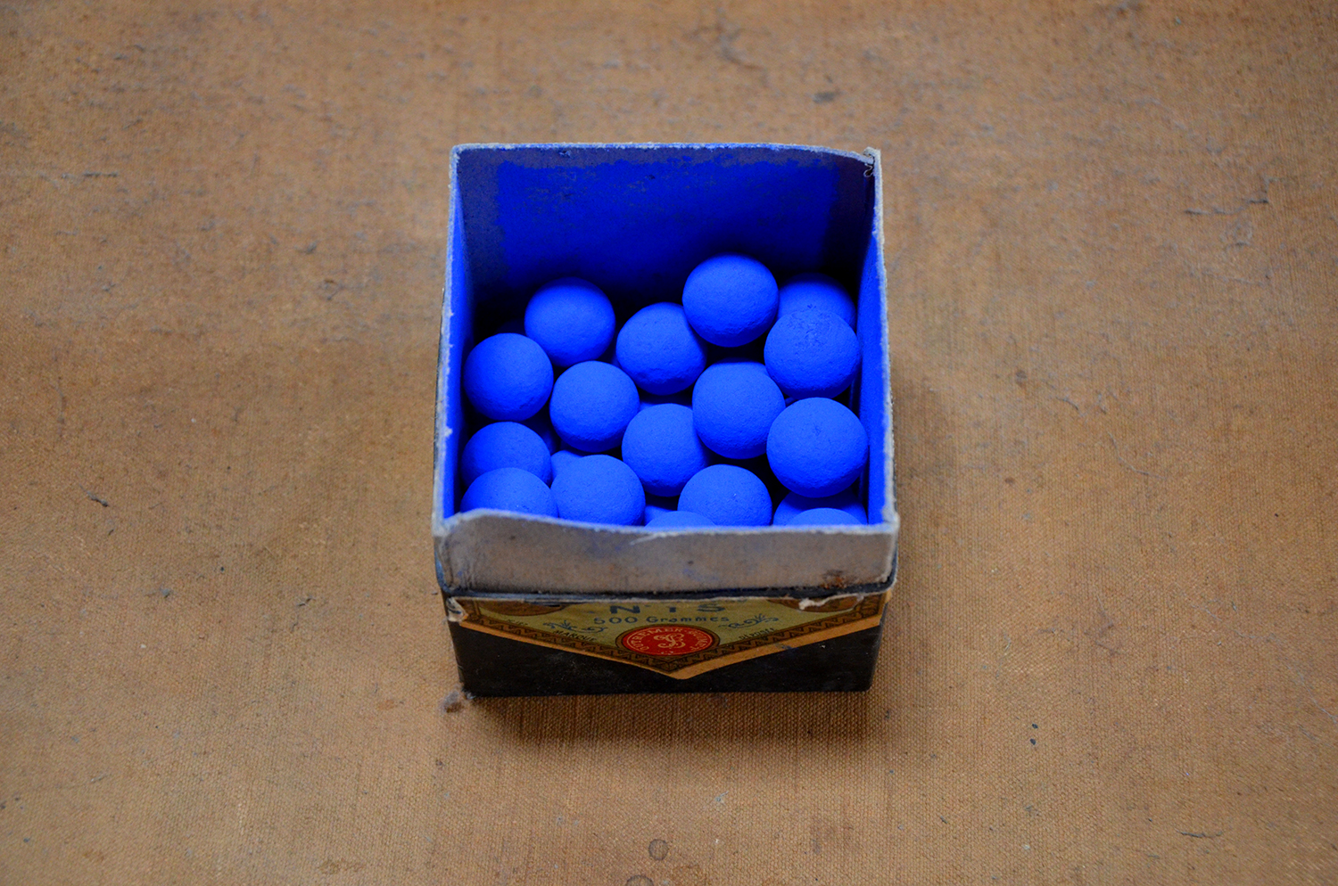 16. Een doosje dat ik wel twintig jaar kwijt was, ik heb het zojuist weer gevonden. Ik vind de kleur prachtig. Volgens mij gebruikte ze deze bolletjes vroeger om de was wit te krijgen.