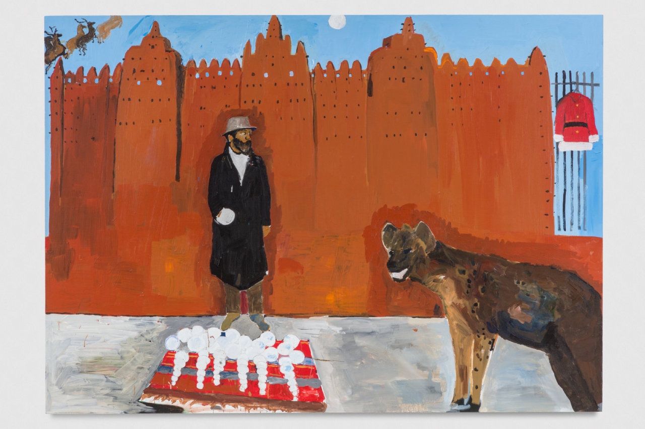 ‘Op het schilderij van Henry Taylor zie ik een hyena, een mand, een soort oranje kasteel en herten. Naast het kasteel hangt een kerstmannenpak. Het lukte me niet meer om de herten en het pak te tekenen, omdat ik het kasteel te groot heb gemaakt. Ik heb geen idee waar dit over gaat, maar als ik iets moest verzinnen zou ik zeggen dat het de Kerstman zelf is op het schilderij. Hij woonde in een kasteelachtig iets, en net toen hij wilde weggaan met zijn slee kwam die hyena en toen gingen die herten van schrik weg. Nu is hij arm geworden en daarom verkoopt hij alles. Ik vind het leuk aan het schilderij dat er veel fantasie in zit. De kleuren zijn echt mooi. Ik krijg wel een verdrietig gevoel van het schilderij, omdat de persoon ook verdrietig is. Misschien dat de kunstenaar iets duidelijker had kunnen tekenen. Want nu is het verhaal erachter niet duidelijk. Maar ik vond het wel een leuke om na te tekenen, juist omdat er zoveel fantasie is.’ – Arda (12)