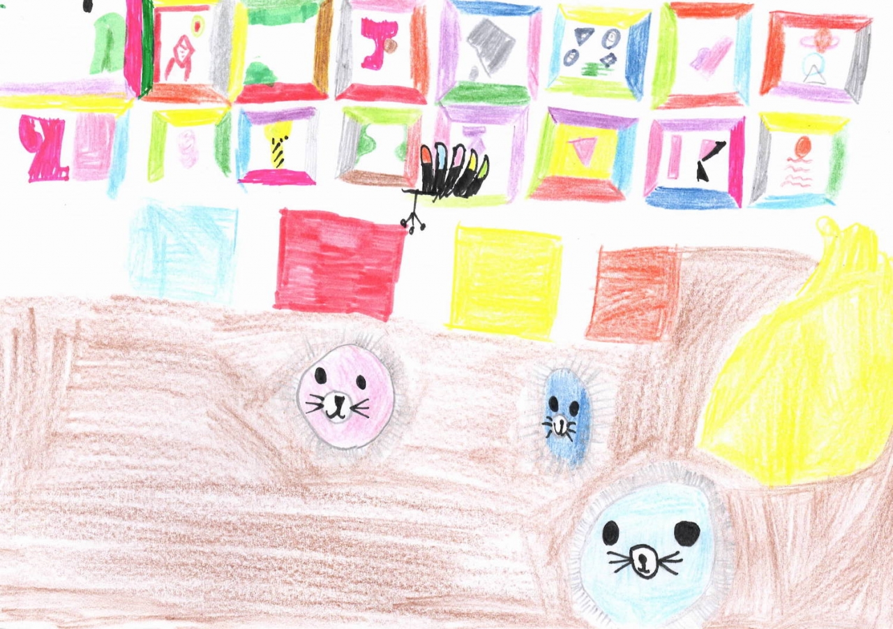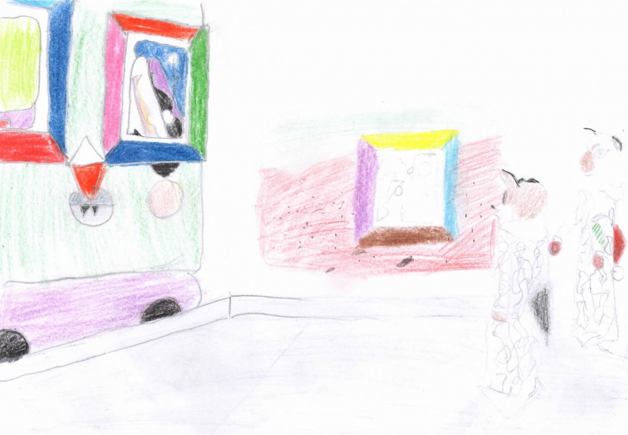 ‘Het kunstwerk van Hrafnhildur Arnardóttir is heel bijzonder. Je ziet overal een soort van haren in een kamer. Achterin is een deur. Ik denk dat de kunstenaar dit heeft gemaakt om de zachtheid te laten zien van deze kamer. Ik vind het mooi, omdat het veel verschillende kleuren zijn. En dat het voorin donker is en achterin licht. Ik denk dat het gevoel van de mensen die dit hebben gemaakt hebben aardigheid en zachtheid is, en dat ze dat willen overbrengen. Dat mensen zich veilig en fijn voelen. Ik had op de foto misschien nog wel iets meer van de kamer willen zien, want er is nu nog een hele hoek die je niet kunt zien. Maar dat is vooral een complimentje, want ik vind de kamer echt heel mooi gemaakt. Ik vond het ook leuk om na te tekenen en ik ben trots op mijn tekening. Het lijkt bijna alsof het echt van zachte stof is. Ik zou dit wel in het echt willen zien. Als ik in deze kamer was zou ik lekker in de haren gaan liggen.’ – Julia (12)