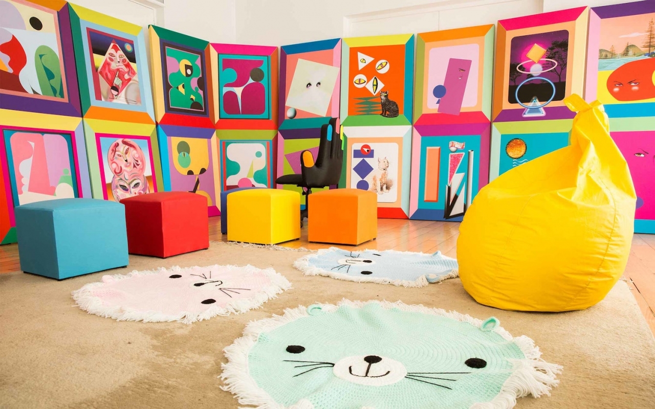 ‘Het kunstwerk van Ad Minoliti geeft me een gezellig gevoel. Dat komt door alle leuke kleurtjes. Het is heel mooi bij elkaar allemaal: de kleuren, de schilderijen en dan die poppen. Het lijkt wel alsof ze kunstkleding aanhebben. Zo cool.’ – Maria (11)