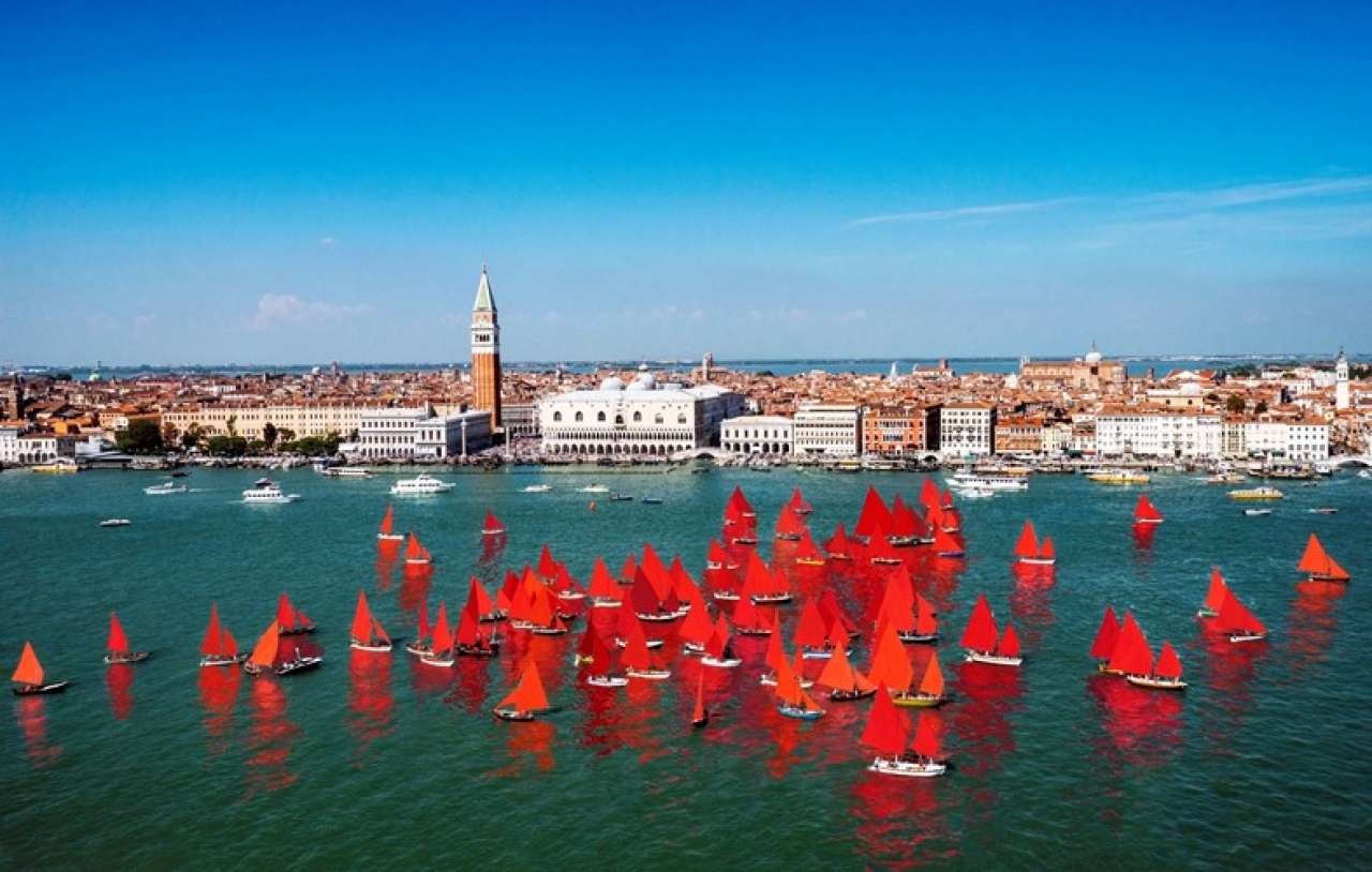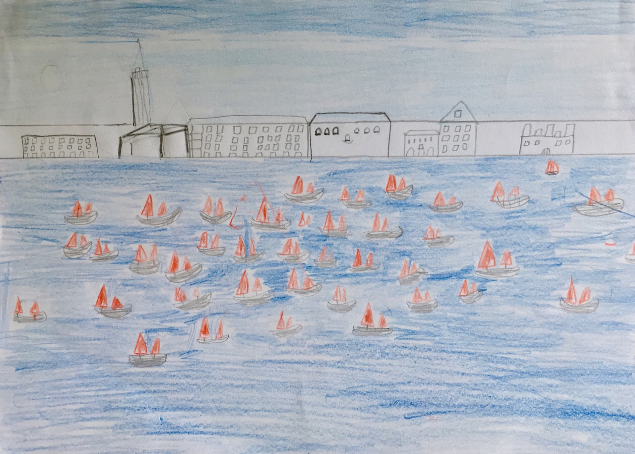 ‘Op het kunstwerk van Melissa McGill zie je wel bijna honderd boten met felrode zeilen. Ze varen in Venetië voor de stad. Het water is nog blauwer dan de lucht. Vroeger had je heel veel van zulk soort boten, maar nu niet meer. Nu heb je meer cruiseschepen en speedboten enzo. Ik denk dat deze kunstenaar gewoon veel van oude boten houdt en wil laten zien dat die veel mooier zijn. En ik denk dat rood haar lievelingskleur is. Ik vind het er wel cool uitzien en ik zou zelf ook wel op een van die boten willen zitten. Zit er op elke boot eigenlijk ook een kapitein?’ – Noah (12)
