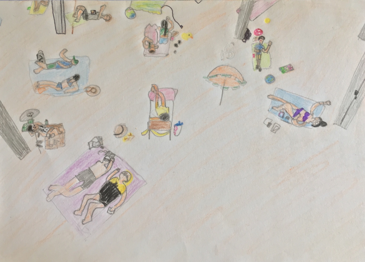 ‘Het kunstwerk is een strand met veel mensen. Ze hebben allemaal hun zwembroek of badpak aan en liggen lekker in het zand. Het lijkt erop dat het een warme en zonnige dag is, maar dit kunstwerk is dus gewoon binnen in een gebouw! Je kunt zelfs vanaf bovenaf kijken naar al die mensen die aan het zonnebaden zijn! Dat vind ik best wel raar. Het lijkt mij in ieder geval niet fijn om daar te moeten liggen. Ik zou liever naar een echt strand gaan. Ik denk dat de kunstenaars het zo gemaakt hebben om mensen een zomers gevoel te geven. Want je ziet veel gekleurde dingen, zoals een parasol en een hoed van stro.’ – Rubia (11)
