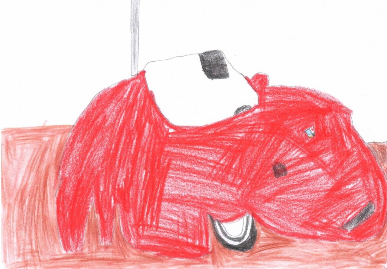 ‘Het kunstwerk van Erwin Wurm is een rode auto. Het is een dikke Ferrari. Daar achter zie je een witte muur en achter die auto zit een soort van keuken. Ik denk dat de kunstenaar het grappig vond dat mensen het altijd hebben over dikke auto’s. En dat hij daarom een keer een echte dikke auto wilde maken. Want die bestaan natuurlijk helemaal niet. Ik vind het heel cool en grappig bedacht. En de auto is eigenlijk ook nog steeds wel mooi. Ik zou er wel een keertje in willen rijden. Misschien met de kunstenaar?’ – Jordi. (9 jaar)