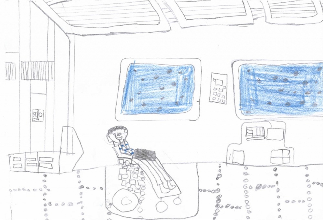 ‘In het kunstwerk van Melanie Bonajo zie ik een oma in een ruimteschip. Het ruimteschip zweeft in de lucht. Door het raam zie je allemaal sterren in het donker. Het is een grappig beeld om te zien. Ik denk dat de kunstenaar dit heeft bedacht om te laten zien dat opa’s en oma’s nog niet te oud zijn om de ruimte in te gaan. Ik ben het daar helemaal mee eens. Ik vind het leuk dat er een oma in een ruimteschip zit, in plaats van een kind. Ik vind het ook leuk voor die oma dat er een keuken in zit zodat ze kan koken. En dat er allemaal lampjes overal zitten zodat ze kan lezen. Zelf zou ik ook wel de ruimte in willen. Misschien doe ik dat nog wel, als ik oud ben. Dat lijkt me wel gaaf.’ – Kyano (9)