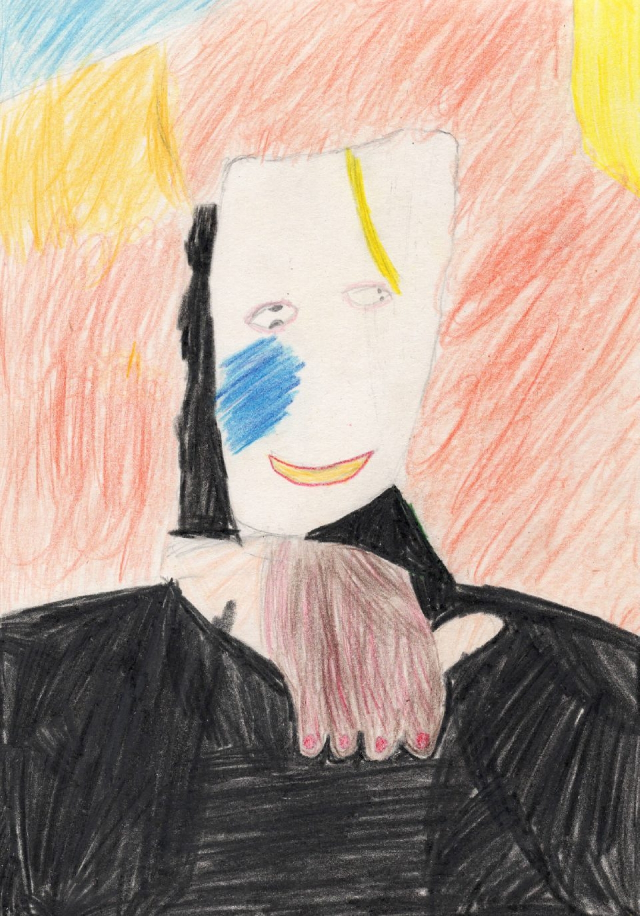 ‘Op dit schilderij heeft Marlene Dumas zichzelf geschilderd. Ze is een vrouw met een nogal aparte houding. Namelijk met haar hoofd omgedraaid en haar hand op haar eigen schouder. Ze heeft een heleboel oranje haar en een zwart shirt. Ze heeft een blauwe vlek op haar wang en ten slotte heeft ze een soort dubbele pupil. Ik vind het schilderij wel apart, want de kleuren in het gezicht zijn totaal anders dan anders. Maar om diezelfde reden vind ik het ook heel mooi. En ik vind dat er veel kleur is gebruikt, en dat vind ik ook goed. Ik denk dat mevrouw Dumas zich wel goed voelde toen ze dit schilderij maakte, en ik denk dat toeschouwers er ook een fijn gevoel van krijgen. Dat vind ik knap, als een kunstenaar dat kan.’ Luca (11)