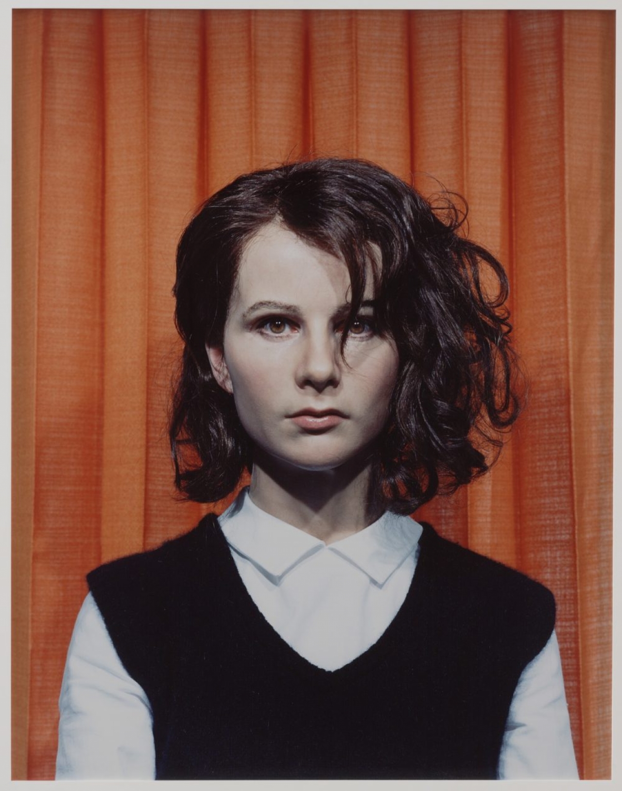 ‘Het meisje op de foto van Gillian Wearing is ongeveer zeventien jaar en ze kijkt heel serieus. Ze staat voor een oranje gordijn. Haar haar is donkerbruin, bijna zwart en krult een beetje. Ze draagt een net wit bloesje en een zwart truitje daar overheen. Ze kijkt je strak aan. Ik hoorde dat de kunstenaar nu veel ouder is, maar dat ze een masker heeft gemaakt van een oude foto van toen ze jong was, en dat ze die op deze foto draagt. Als je goed kijkt zie je ook lijntjes om haar hogen van het masker. Ik denk dat ze wilde kijken of ze zich anders zou voelen met dit masker op. Want als je jonger bent voel je je ook anders. Ik voelde me ook anders toen ik zeven was. Ik zou wel willen weten hoe zij zich voelde toen ze de foto maakte. Maar ook hoe ze zich voelde toen ze jonger was. En ik ben benieuwd hoe ik me voel als ik zeventien ben. Dat vind ik ook het leuke aan de foto, dat je erdoor gaat nadenken over wie je bent.’ Madelief (12)