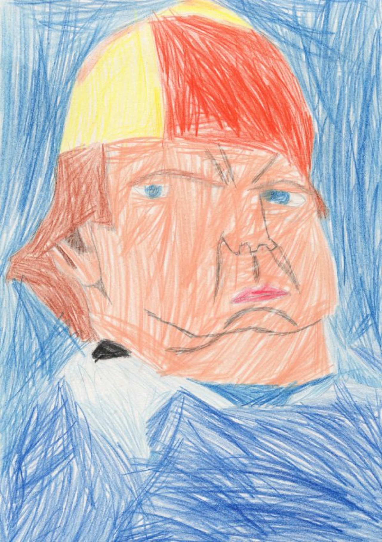 ‘Philip Akkerman is een kunstenaar die bijna veertig jaar portretten van zichzelf maakt. Hij heeft er dus al wel meer dan honderd gemaakt. Ik vind het heel prachtig en mooi dat er zo veel contrast op zit. En hij heeft een mooie gele hoed op. Ik vond het een makkelijke tekening om te maken, maar ik zou het niet elke dag willen doen. Al helemaal niet van mezelf. Dat lijkt me best lastig om vol te houden. Hij had ook gewoon elke dag een foto kunnen maken, dan was hij sneller klaar. Maar dit is creatiever. Dat trekt mensen wel aan, omdat mensen dan gaan nadenken waarom hij dat doet. Ik ga daar ook nog even over nadenken want ik snap het nog niet. Maar goed gedaan, Philip!’ – Arnoud (11)