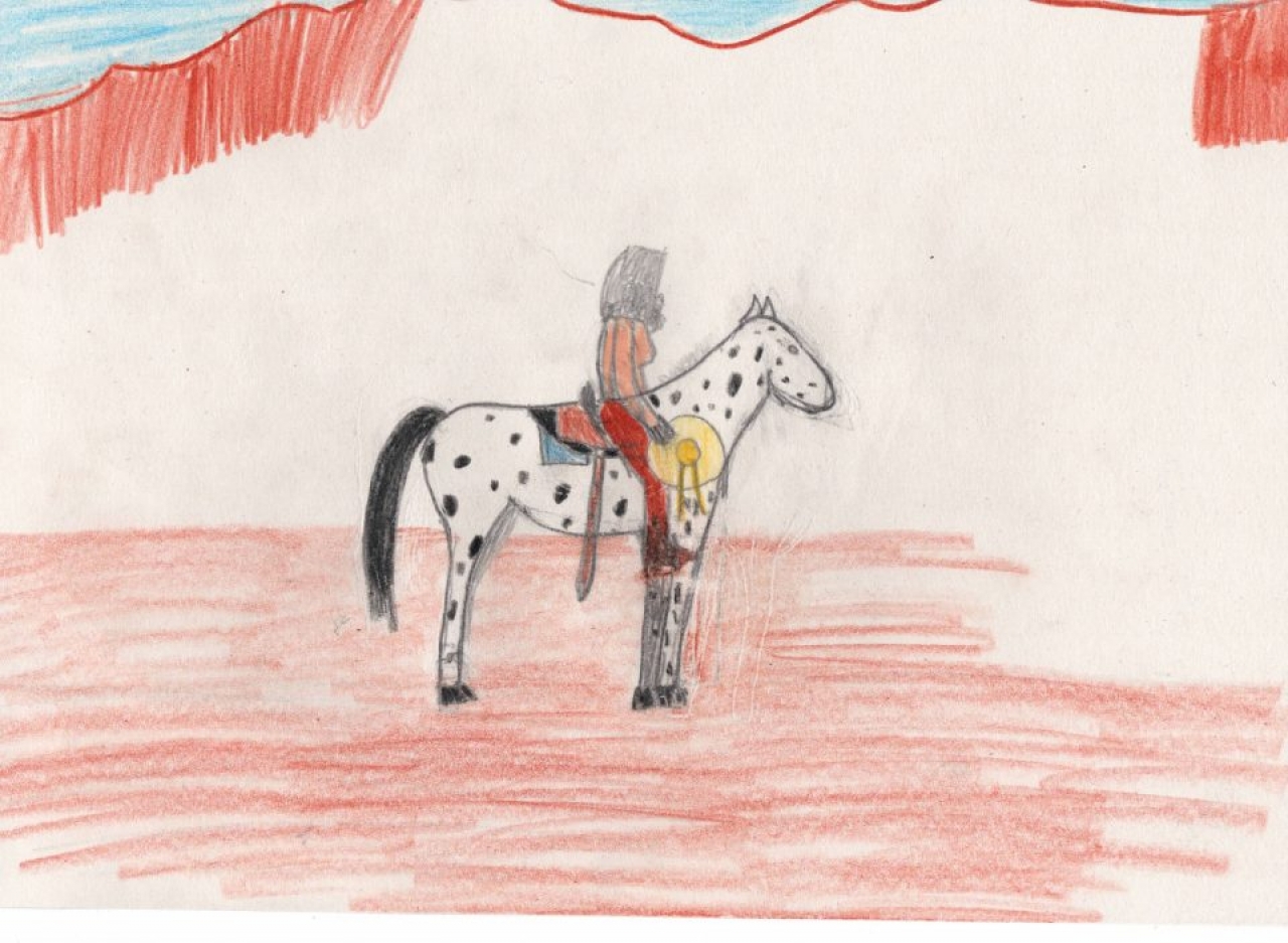 ‘Het kunstwerk is een foto van een vrouw op een wit paard met zwarte stippen. Ze heeft blond haar, een bruine broek en een witte cowboyhoed in haar hand, met gele linten. Ze staat in een dor landschap met zand en steen en hier en daar een plukje gras. Op de achtergrond zie je bergen. Ik denk dat de foto in Amerika is gemaakt en dat het op die dag erg warm was. Ze kijkt jammer genoeg niet naar de camera, maar ik denk dat het een hele stoere vrouw is. Ze is een cowboy, en dat zijn nooit vrouwen. Ik denk dat ze veel avonturen beleeft en ik zou graag eens met haar mee gaan.’ – Lidewij (11)