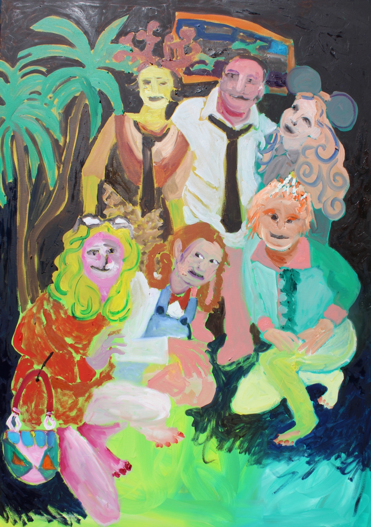 ‘Het schilderij van Tanja Ritterbex is een groepsselfie, maar dan geschilderd. Er staan zes mensen op, met de kunstenaar links vooraan. Het is een erg kleurrijke groep en er staan twee palmbomen, maar de ruimte zelf is heel donker. Daardoor springen ze er echt uit. Ik denk dat de kunstenaar het heeft gemaakt omdat ze veel van de mensen op het schilderij houdt. Ze zijn echt met liefde geschilderd. Ik denk dat toeschouwers van dit schilderij zin krijgen om met hun eigen vrienden te zijn. Ik wel in ieder geval. Ik heb mijn tekening niet af gekregen, want dit schilderij is nog stukken moeilijker dan die lijkt. Dus iedereen die denkt dat het makkelijk is: probeer zelf maar eens!’ Eline (12 jaar)