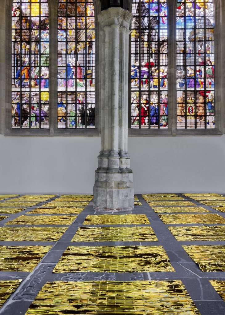 Terwijl ik lees over tijdafhankelijke kleuren die in de tijd tussen lichtval en waarnemer ontstaan, moet ik denken aan het goud van Sarah van Sonsbeeck. In 2017 was de geplaveide vloer van de Oude Kerk in Amsterdam bedekt met het goudkleurig folie van Mylar blankets. Dit zijn de beschermende dekens die een symbool zijn van mensen op de vlucht die van onderkoeling gered zijn en als bewijs een gouden deken om zich heen geslagen hebben gekregen. Ik kan me herinneren dat ik meer dan eens in de kerk ben gaan kijken. Daarbij herinner ik me vooral de lichtval tijdens één van die bezoeken. Uit de hoge kerkramen scheen het daglicht op Van Sonsbeecks werk We may have all come on different ships, but we’re in the same boat now. Een glimmende, blinkende kleurenpracht bleef net boven het folie hangen. Als een ziel, de geest, een aanwezigheid van levens die met deze gouden dekens verbonden zijn. Bezield goud, een levende en sprankelende kleur. De glans deed precies wat Katz beschreef: ze vulde ruimte en tijd.