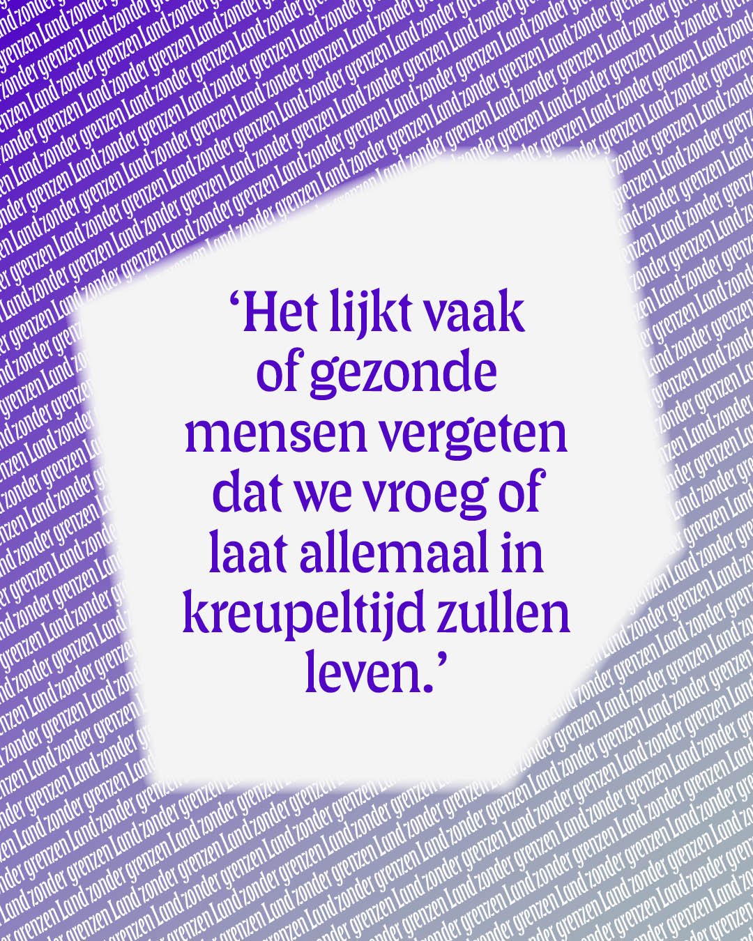 ‘Kreupeltijd is een begrip dat gaat over de manieren waarop mensen met een beperking/chronische ziekte en neurodivergente mensen (de kreupelen, geuzennaam, red.) tijd en ruimte anders ervaren dan mensen zonder beperking. Het lijkt vaak of gezonde mensen vergeten dat we vroeg of laat allemaal in kreupeltijd zullen leven.’ In haar nieuwste bijdrage voor de reeks Land zonder grenzen verbindt Jam van der Aa het begrip kreupeltijd aan haar lezing van het boek De prullenbak heeft veel plezier aan mij van Thomas Heerma van Voss, waarin hij schrijvers op leeftijd interviewt over hun leven en loopbaan.