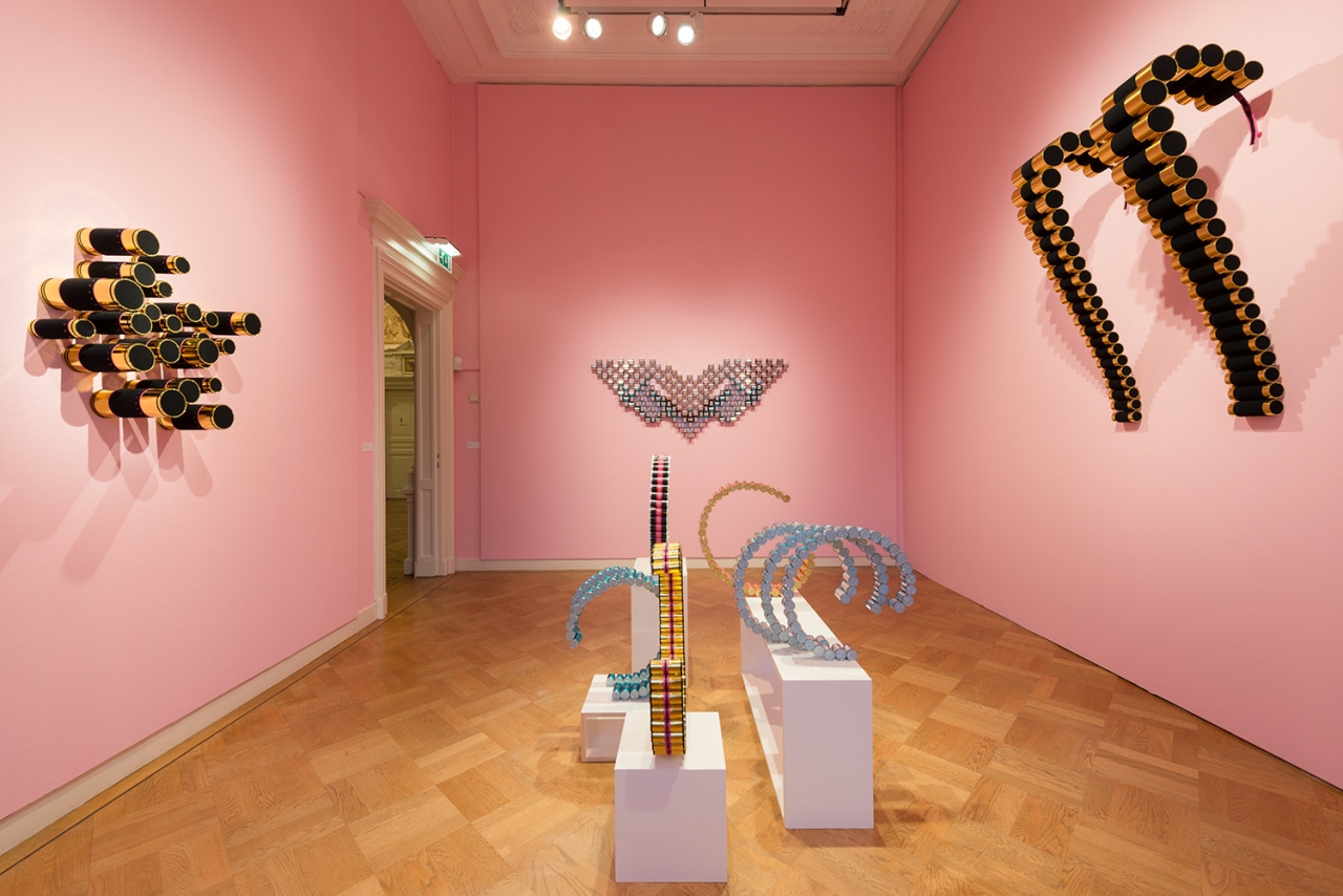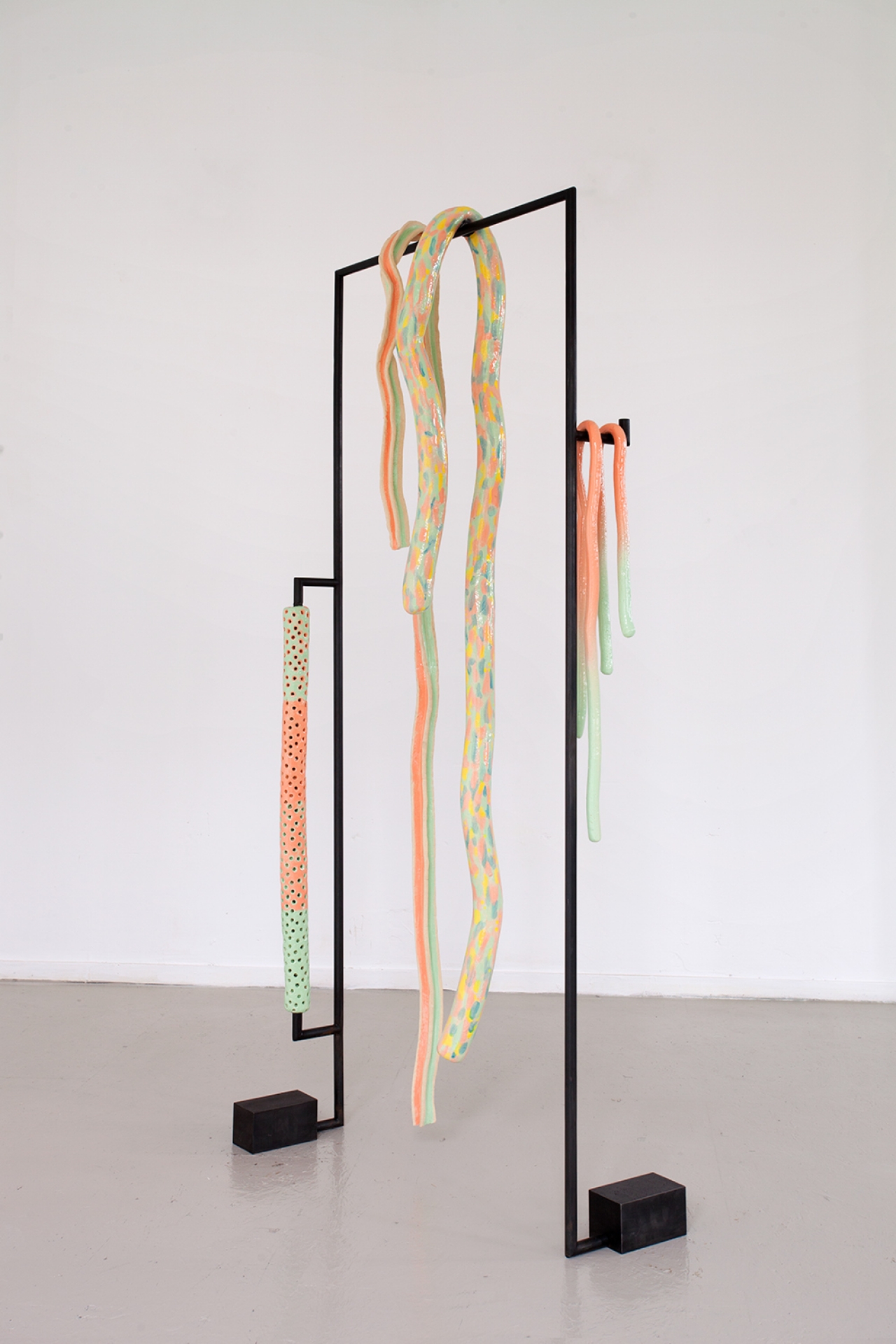 In het atelier van Maartje Folkeringa zijn meerdere sculpturen in de vorm van slangachtige keramische objecten te zien, werk dat ze is begonnen tijdens een residentie in het Europees Keramisch Werkcentrum (EKWC). De serie Display (Premium time-out) presenteert ze op de manier die in mode en kledingzaken wordt gebruikt om collecties te tonen, hangend aan rekken. De precieze aard van het werk is moeilijk te definiëren, maar de eerder gemaakte serie Premium laat uitvergrote versierselen zien in goudluster (gouden glazuur) in combinatie met keramiek, epoxy en plastic. Ander werk bestaat uit bewerkingen van sieraden, juwelen, trofeeën, wapenschilden en bling bling in allerlei glimmende materialen die op het oog indruk maken, maar die als lege hulzen onthullen wat de werkelijk waarde van uiterlijk vertoon is. Titels als ‘Faux Pas’ geven de dubbelzinnigheid van dit werk goed weer.