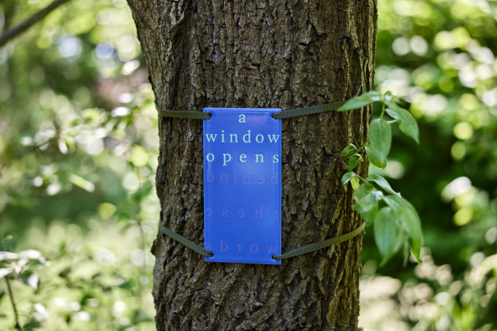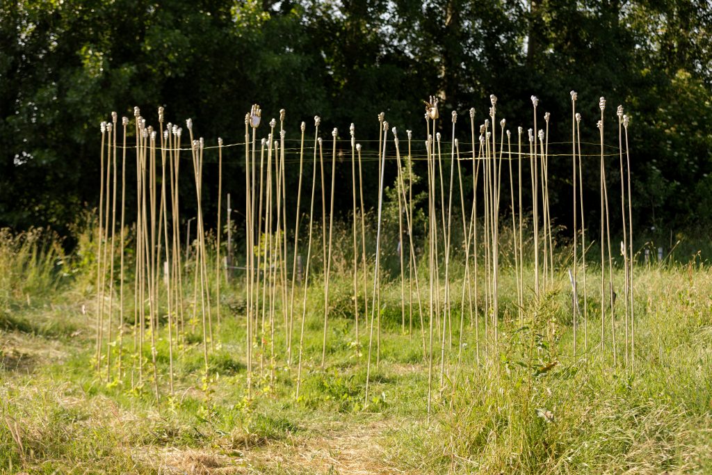 Langs de kerk beweegt zich een pad naar een klein weiland, met daarachter een uitnodigende bosrand. Terwijl ik er heenloop wordt mijn aandacht getrokken door tientallen bamboestokken die op een kluitje bij elkaar staan. Bovenop de stokken rusten allerlei kleine geboetseerde beeldjes waarvan sommige lijken op mensenhanden. Als ik dichterbij kom zie ik dat het twee cirkelvormige velden zijn die als een lus in elkaar overlopen. Aan de onderkant van de stokken groeien diverse soorten klimplanten omhoog. Sharing the Same Womb is de titel van het werk, gemaakt door Marija Šujica en Müge Yilmaz, beide lid van het het kunstenaarscollectief Four Siblings.