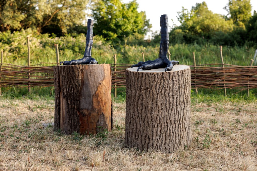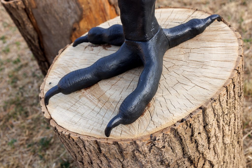 Het einde van de dag nadert en mijn gedachten drijven af in de richting van het avondeten. Ik verman me, want ik ben nog niet helemaal klaar. Er is nog één deel van de kunstroute dat ik nog niet heb gelopen, het pad door de ‘bloemenweide’. Eenmaal daar aangekomen valt mijn oog op twee grote keramische zwarte kraaienpoten die op boomstronken zijn geplaatst. Doordat ze zijn uitvergroot, zie je goed hoe machtig en krachtig de klauwen zijn; drie wijzen naar voren, éen naar achteren en aan het eind van elke teen scherpe, gebogen, glanzend zwarte nagels.