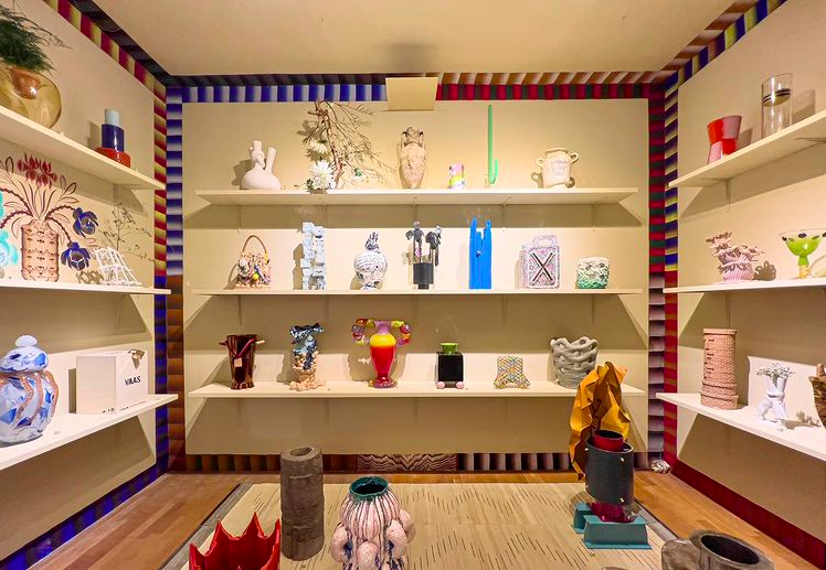 Hoewel de ambitie van The Frozen Fountain altijd geconcentreerd is geweest op ontwerpers hebben Cok de Rooy en Dick Dankers ook werk van autonome kunstenaars in hun winkel getoond. In de huidige jubileumpresentatie is naast het werk van 3D-ontwerpers een aantal wanden volgehangen met 2D werk van zeer uiteenlopende kunstenaars en ontwerpers die bij elkaar een samenhangend beeld laten zien van hoe je door integratie van kunst en vormgeving een specifieke identiteit kunt ontwikkelen. Die is puur gericht op talent en kwaliteit. Cok de Rooy: “Herkenning van talent is altijd een stil moment. Het heeft ermee te maken dat iemand iets maakt wat een vertaling is van het tijdsgewricht, waardoor het opvalt en voor ons relevant is. Dat geldt ook voor de kunstenaars die we laten zien. Ook via mijn vrouw Yvonne Kroese heb ik een grote vrienden- en kennissenkring in de kunst. Als ik met een goede vriend van mij, een rasechte kunstenaar, over zijn werk in de publieke ruimte praat, over oplossingen voor wat betreft het installeren ervan, dan weet hij soms niet waar hij beginnen moet. ‘Ik ben geen ontwerper,’ zegt hij. Een andere kunstenaar met wie we werken is Gijs Frieling. Hij heeft voor de presentatie van de jubileumvazen op de achterwand een vaas geschilderd. Zijn schilderingen in interieurs en op kasten vermengen autonome kunst en toegepaste ingrepen. Door zijn samenwerking met de typografische kunstenaar Job Wouters krijgen zijn schilderingen een herkenbare uitstraling. Ze slaan binnen het interieurontwerp een brug tussen de toegepaste kunstvorm van belettering en teken- en schilderkunst.”