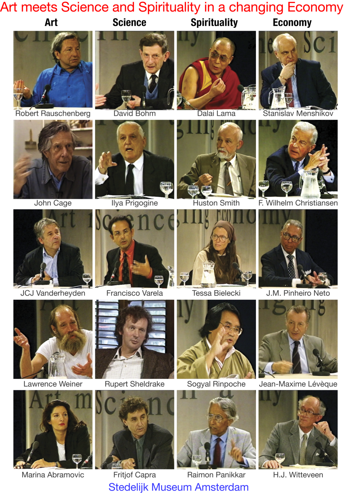 En dat klopt. De eerste keer dat ik Louwrien Wijers ontmoet, is voordat ze in het Fries Museum in november vorig jaar de Gerrit Benner Prijs krijgt uitgereikt voor haar werk. We omhelzen elkaar spontaan. Ik zie daar haar eerste museale solo van haar best lange leven – vol tekstwerken, metalen sculpturen en de complete videoregistratie van het roemruchte, vijfdaagse symposium ‘Art meets Science and Spirituality in a changing Economy’ in 1990 in het Stedelijk Museum in Amsterdam. Vijf dagen lang was het Stedelijk in 1990 het zenuwcentrum van de wereld, waar (nobelprijs)wetenschappers als Ilya Prigogine, David Bohm en Fritjov Capra samenkwamen met spirituele leiders zoals de Dalai Lama, Sogyal Rinpoche, Huston Smith en Raimon Panikkar, en kunstenaars als John Cage, Robert Rauschenberg, JCJ Van der Heyden, Lawrence Weiner en Marina Abramovic. Samen onderzochten ze hoe een nieuwe wereldorde eruit zou kunnen zien, die gebaseerd is op kunst en creativiteit, niet-kapitalistische, democratische denkbeelden en spiritualiteit.