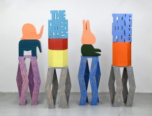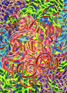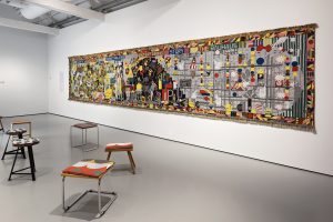 Deze week is Koen Taselaar te gast in Kunst is Lang. Het werk van Koen bestaat naar eigen zeggen uit het stapelen van motieven. Soms letterlijk, in het geval van een silhouet-sculptuur van een slak bovenop een olifant. Maar ook figuurlijk, binnen zijn vaak psychedelische wandtapijten, vormen verschillende motieven het totaalbeeld. Neem het acht-en-een-halve-meter lange werk over de geschiedenis van Bauhaus: letterlijke verwijzingen naar het gedachtegoed worden vermengd met avatar-achtige poppetjes, met de cactussen die oprichter Walter Gropius verzamelde, met dansende letters en sterren, en met langs de rand een kader van abstracte vormen en kleuren. De stapeling gaat door tot er een werk is ontstaan dat verrast, nét iets te vol is en ook een tikkeltje lelijkheid heeft.