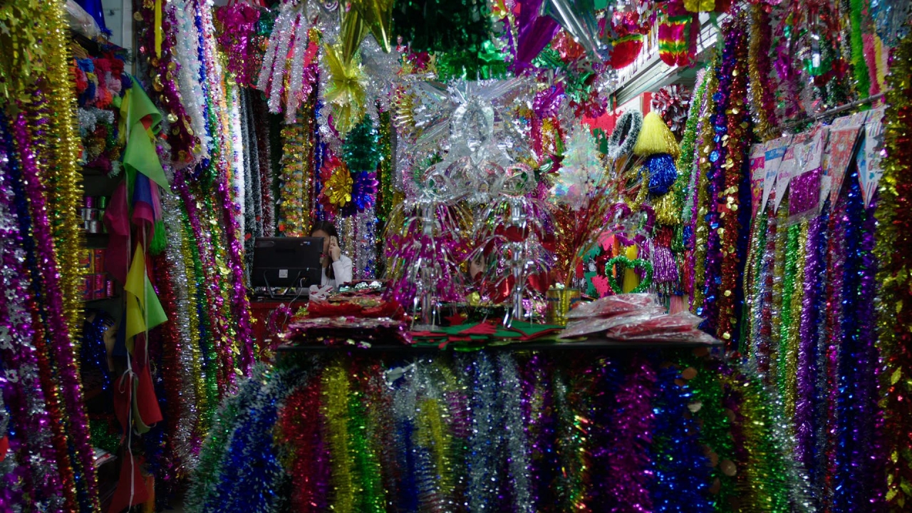 Achter een overdadige muur van glinsterende feestversiering, bevindt zich de minstens zo overdadige video van Mika Rottenberg. Het werk toont tientallen verschillende beelden van winkels uit de Chinese stad Yiwu, die allemaal zijn ingericht door iemand die niet zo goed kan kiezen. De vele lichten, lampen, glitters en knuffels maken van iedere etalage een psychedelische Efteling-attractie. De vrouwen in de winkels – het grauwe in hun blik steekt af tegen de glinsterende slingers – proberen de tijd te doden door het spelen van patience op de computer of het doen van een dutje op de kassa. Het zijn absurdistische beelden waarvan je hoopt dat ze geënsceneerd zijn, omdat je simpelweg niemand uitputtende werkdagen tussen hevig flikkerende en piepende speelgoeddieren gunt. Deze vrouwen weten niet anders. Dat ze niet eens meer op of om kijken van hun schreeuwende koopwaar, maakt het nog pijnlijker. Hun wereld: zo kleurrijk, maar tegelijkertijd deprimerend grijs.