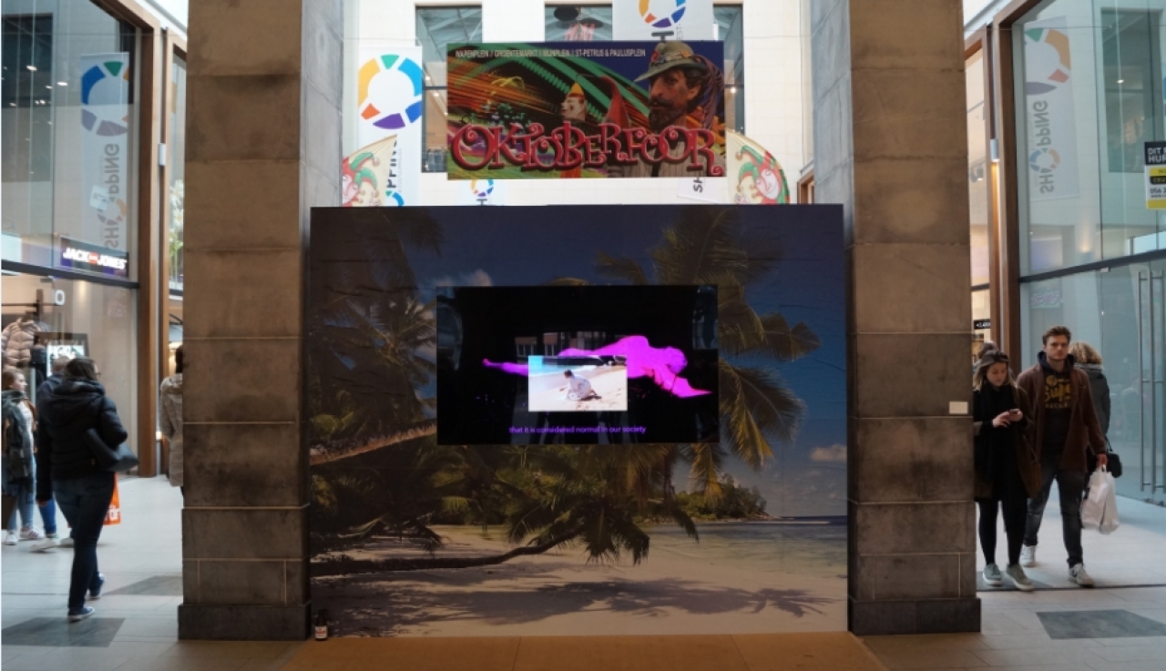 Het is moeilijk te bepalen waar het werk van De Roover ophoudt en waar de publieke ruimte weer begint. Een video wordt vertoond tegen een muur met palmbomen boven een lichtblauwe zee. Als beschouwer bekijk je het werk onderuitgezakt vanuit een ouderwetse strandstoel, en met een beetje fantasie denk je de frisse cocktail en een willekeurig ontbloot bovenlijf erbij. Niets is minder waar. Je bevindt je in een ongezellig winkelcentrum zoals alleen winkelcentra dat kunnen zijn. Elektrische poortjes gillen, kinderen in buggy’s ook, en uit de krakende boxen in het plafond klinkt Michael Bublé. In de video zoekt de kunstenaar een beeldend antwoord op de religieuze vraag of we het idee van een almachtige schepper wel voldoende in twijfel trekken. Een inhoudelijke kwestie, terwijl Kruidvat me ook vertelt welke aanbieding ik deze week echt niet mag missen. Het stoort aan alle kanten, maar wat is het een verademing in vergelijking met de eentonige white cube.