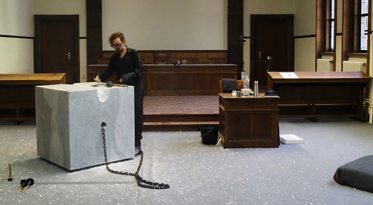 In de rechtszaal van het gerechtsgebouw in het midden van de stad vindt een performance plaats. Mikes Poppe zit vastgeketend aan een groot blok marmer, waar hij zich met hamer en beitel van probeert te bevrijden. Of dit enkele dagen of meerdere weken gaat duren, weet de kunstenaar aanvankelijk niet. Ik ben aanwezig op dag drie; als ik naar het kleine hapje uit het blok kijk, denk ik dat Poppe nog wel wat nachten in gevangenschap zal moeten doorbrengen. Een matras op de grond, een wc-rol in de hoek en een gevulde thermoskan – hij drinkt zijn koffie met een suikerklontje – zijn onmisbare rekwisieten om de performance door te komen. De Profundis beeldt een metafoor uit van het hedendaagse kunstenaarschap. Het marmer is een traditioneel materiaal, dat verwijst naar de klassieke kunsttradities waar men vandaag de dag van los zou moeten komen, aldus de kunstenaar.