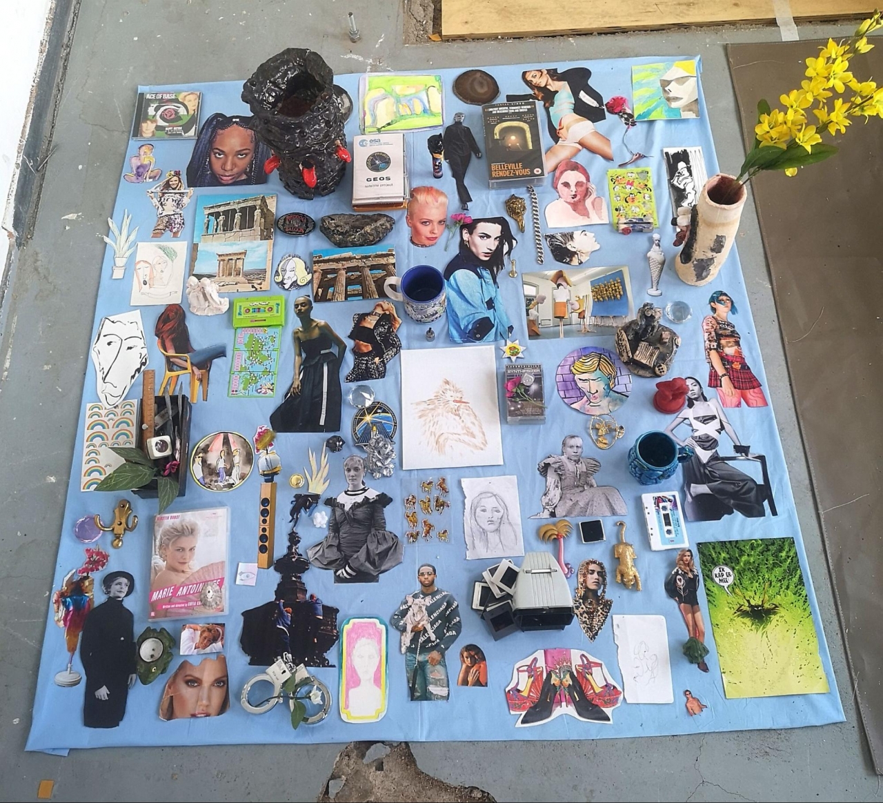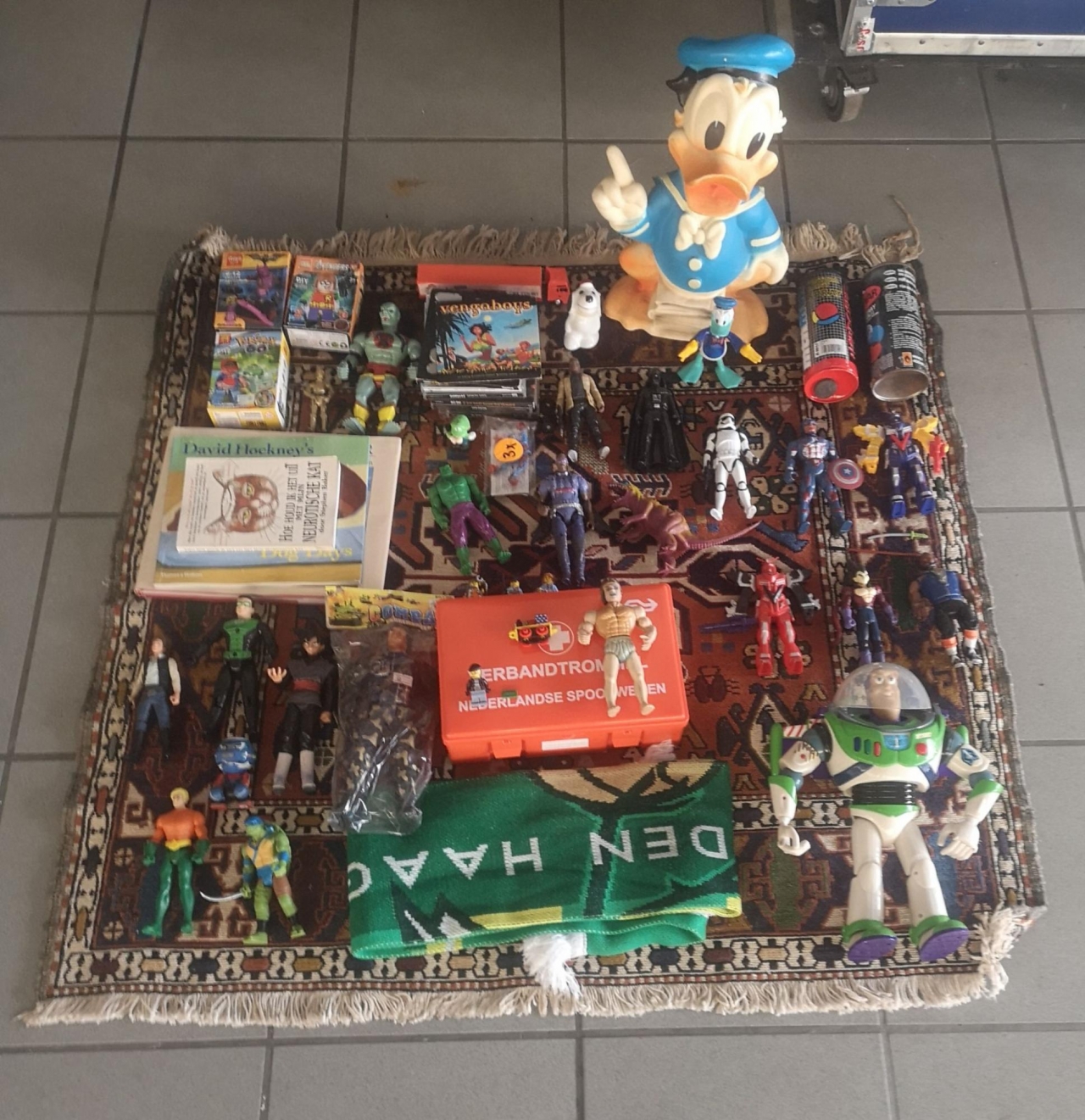 Het uitgangspunt van de tentoonstelling was hetzelfde als die van een Koninginnedagvrijmarkt: natgeregende kleedjes met oude spullen die je eigenlijk niet nodig hebt en een flinke dosis nostalgie. (afb. 7, 8, 9, 10, 11) Het grote verschil was dat er nergens een prijskaartje bij stond en dat er geen roepende mensen bij stonden die van hun spullen af probeerden te komen. Daarnaast was er ook meer aandacht en zorg besteedt aan de kleedjes dan gewoonlijk gebeurt op Koninginnedag. De pseudo-psychoanalytische reden hiervoor: naarmate je ouder wordt ga je je herinneringen en daarmee je oude spullen meer koesteren. Alle deelnemende kunstenaars hebben de leeftijd van twaalf, dertien gepasseerd waarna het sociaal niet meer acceptabel is om nog op Koninginnedag Donald Ducks en CD’s te verkopen. Misschien dat ze daarom, nu het wel weer kon ter gelegenheid van de tentoonstelling, hun spullen eigenlijk niet wilden verkopen en dat ze om die reden met extra toewijding hun kleedje hadden opgesteld.