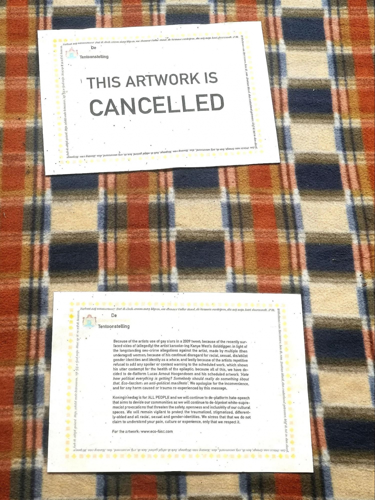 “… [aantijgingen tegen de gecancelde kunstenaar] … Because all of this, we have decided to de-platform Lucas Arnout Hoogendoorn and his scheduled artwork “Hate how political everything is getting? Somebody should really do something about that. Eco-fascism: an anti-political manifesto’ We apologize for the inconvenience, and for any harm caused or trauma re-experienced by this message. …”