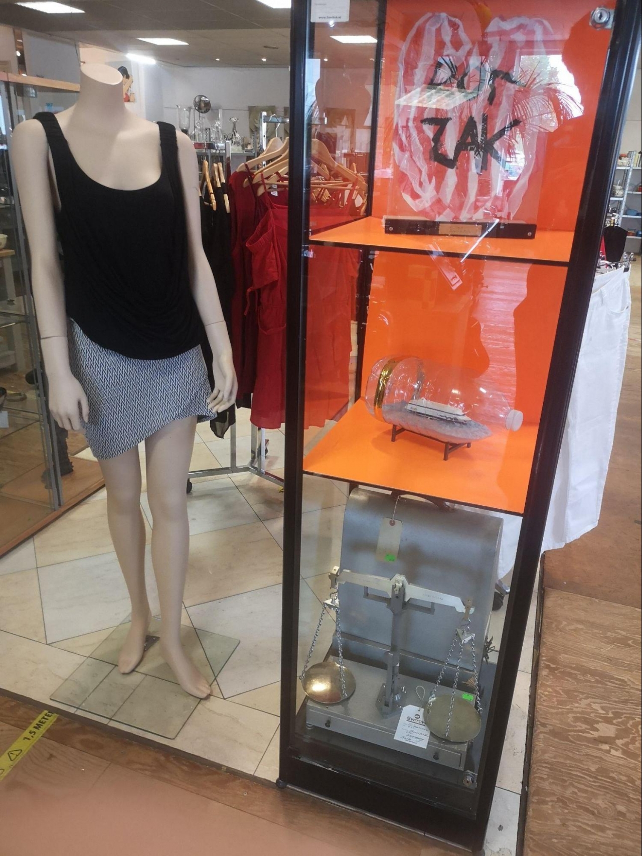 Een paar dagen later waagde ik nog een poging, dit keer met succes. De winkel was nog open. Het leek nog steeds verdacht veel op een kringloopwinkel, maar eenmaal binnen viel er wel een onderscheid te maken tussen de gebruikelijke kringloopartikelen en de kunst/designobjecten van WhiteNoiseDADA doordat die met veel neon oranje gekenmerkt waren. (afb. 2)