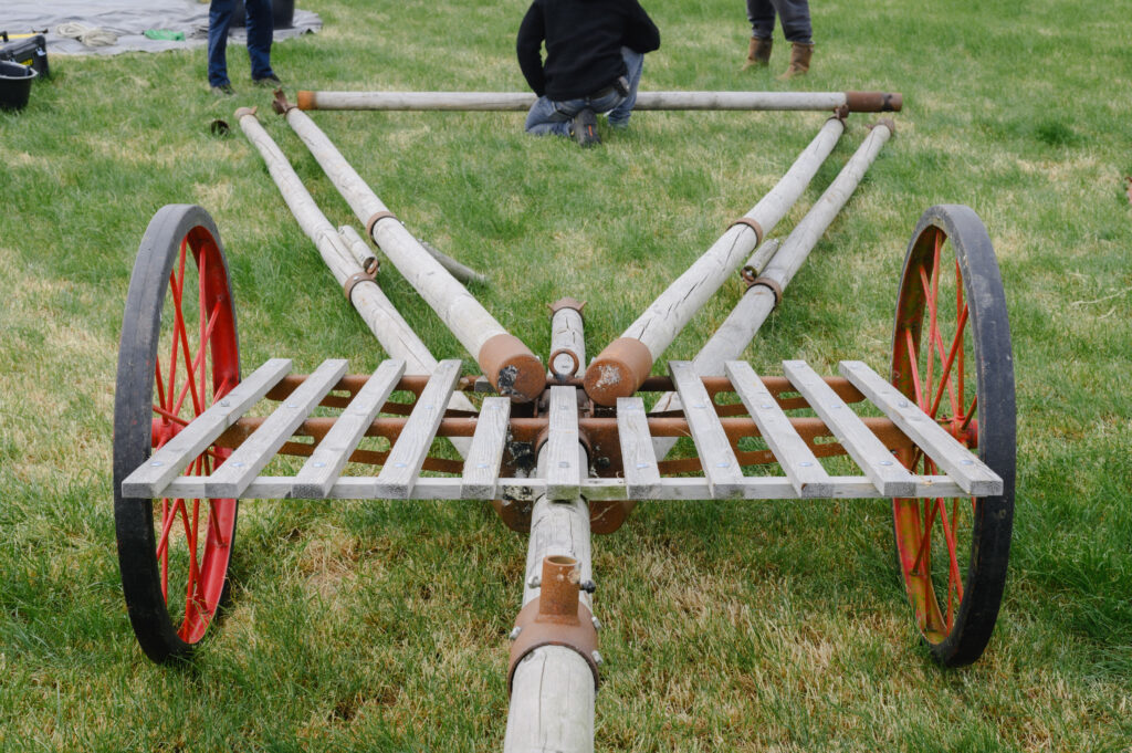 De objecten die de lijn activeren maak ik op Vlieland. Ik vind het belangrijk dat de tijdelijke bakens met materiaal van het eiland gemaakt zijn. Het materiaal is al op het eiland en hoeft alleen nog maar bewerkt te worden. Op Vlieland is Karel Nouta iemand die je dat niet hoeft uit te leggen. Hij maakt timmerwerk van gejut en eiland hout en biedt ons de mogelijkheid om met grenenhout van Vlieland te werken. Hij zaagt en schaaft schaaldelen tot planken van tien centimeter breed. Zijn werkplaats achter de jachthaven mag ik voor een week gebruiken.