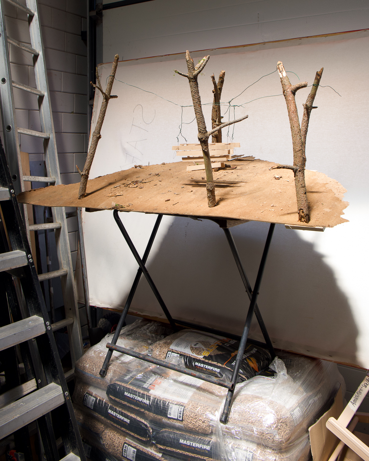 Eind juni verzamel ik droge takken in de kuil. Niet om een vuurtje te maken op het strand maar voor een model. Ik zoek ze uit op dikte. Met een dikte van 3,5 centimeter wordt de tak een boomstam in de maquette. Het inmeten van de bomen en het werken in een schaalmodel helpt me om de ruimtelijke beleving van de plek te sturen. Hoe kan ik gebruikmaken van de bomen om een merkteken op te hangen? Welke maat kan het werk tussen de bomen hebben? Met eenvoudige latjes, staaldraad en een houtvezelplaat maak ik de kuil zichtbaar. Ik kruip achter mijn camera en zak tot ik als het ware in de kuil zit. Klik. Ik til het schermpje van mijn camera omhoog en kijk naar het resultaat. Ik denk dat ik het zie, het zou hoger kunnen hangen.