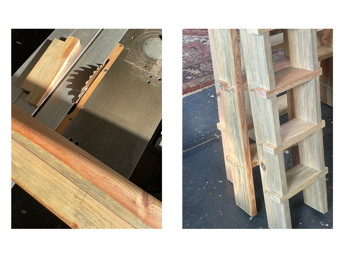 In de werkplaats inspecteer ik het hout en zie dat het zo ongeveer haaks gezaagd is op de richting van de nerf, dat betekent: half kwartiers gezaagd. Planken die naast elkaar in het zicht komen laat ik variëren in kleur en tekening. Zo wisselen knoesten, rode gloed en elegante vlammen elkaar af. Ik zaag inkepingen om halfverbindingen mogelijk te maken. Zo houden de planken elkaar vast. Zonder lijm, sla ik met houten deuvels de planken aan elkaar vast. Van dichtbij zullen die details opvallen, maar van veraf vormen de elementen samen herkenbare structuren voor herdenking of verstilling.