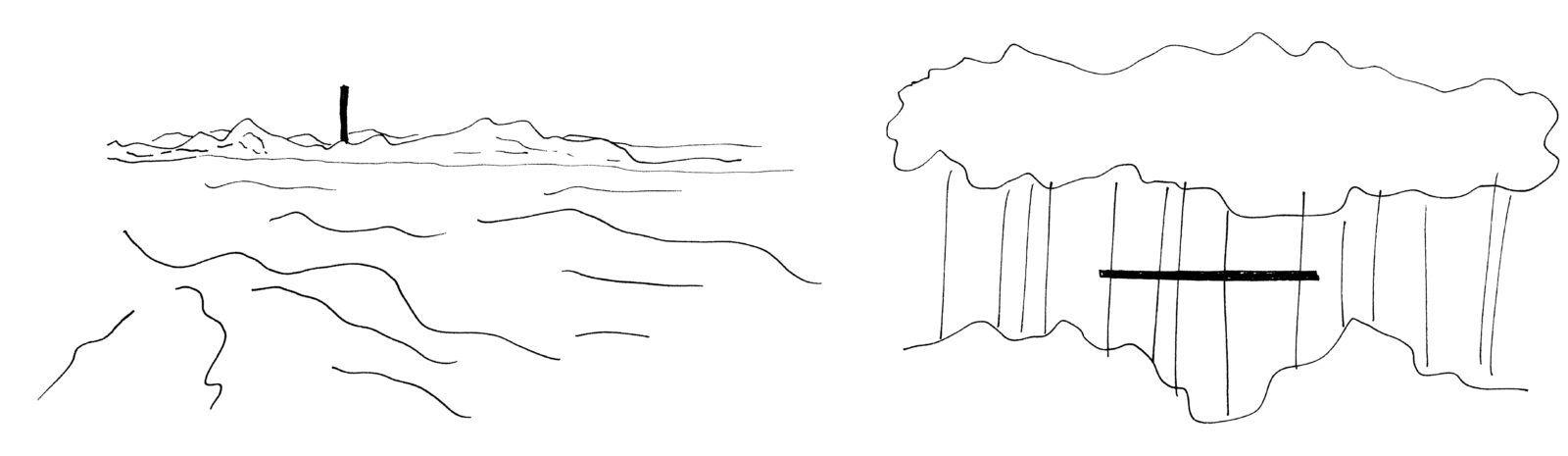 Nu in het bos, door de verticale stammen, zou juist een horizontale onderbreking een duidelijke markering zijn. Voor ons valt dit samen met het idee van de lijn en het gevoel in het bos te willen zakken. Hoe kan een ruimtelijke interpretatie van een kaap dit gevoel in de kuil in het bos vastgrijpen?