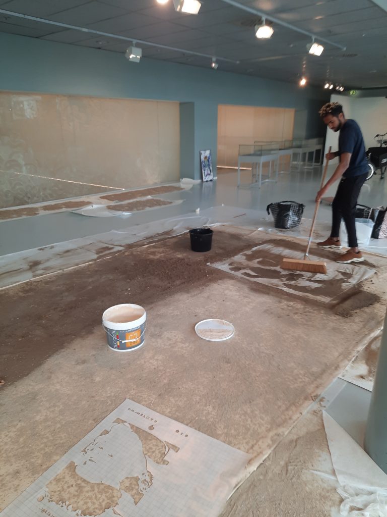 SB: Dat werk zorgde voor een grote puinhoop gedurende de hele opbouwweek. Ik probeerde een landschap te maken en daarmee een woordspeling op het woord ‘naturalisatie'[1]. Het is een beeld dat binnengevallen wordt door zijn omgeving [Zoals naturalisatie te zien is als het binnendringen van iemands individualiteit om deze aan te passen aan de omgeving]. Ik heb sjablonen gemaakt en deze vervolgens met zand overgezet op de stof. Daarbij verloor ik ontzettend veel ‘informatie’ maar kreeg ik wel al die texturen en variaties. Sommige opgeplakte objecten en stukken zand vielen ervan af en andere stukken bleven.