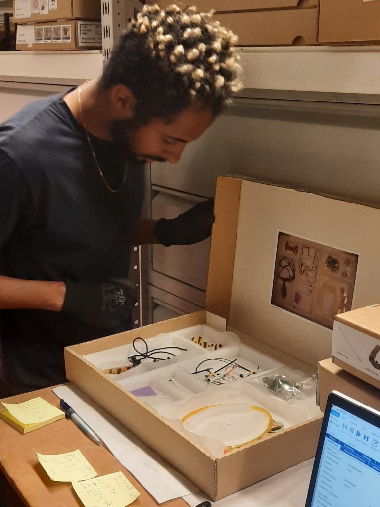 Bijna alle objecten die ik heb uitgezocht uit het archief zijn ‘onbekend’. Ze weten niet wie of wat, ze zijn er gewoon. Zoals de twee grote stenen en twee prachtige bezems die in de tentoonstelling liggen.