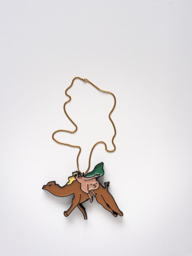 Een van de vele kunstwerken die Bayri in CODA Museum toont zijn de kleine sieraden die hij “wearables” noemt (“because you can wear them”, aldus Bayri). Meerdere van deze wearables liggen in een archiefkast van het museum op zaal. Zo ook de wearable ‘Stamina’. Dit is een 3D-geprinte ketting die de mythe van Europa verbeeldt, maar de koe uit het klassieke verhaal heeft hij vervangen door een kameel: “Because its faster and can also run longer”, legt Bayri droogjes uit. De archiefkast ligt verder vol met allerlei artefacten van zowel Bayri zelf, als objecten die hij uit het museumdepot heeft gehaald. Zo ligt er naast de kamelen-ketting een metalen ‘Pijpenpeuter’ uit de negentiende eeuw, een eeuwenoude rozenkrans en een eigen wandsculptuur gemaakt van kurk. Rondom de vol beladen kast hangen er meerdere kleine sculpturen aan de muur. Daarnaast is er een dubbele fotoprojectie op een met karnemelk besmeurd raam te zien en staat er als “pièce de résistance” midden in de zaal een installatie met twee metershoge doeken. Op het ene doek (Dig) zijn korrelige zandsjablonen en straatvuil aangebracht terwijl het andere doek (Dig in my screen) een ‘gladde’ digitale tekening toont van een moderne ruïne.