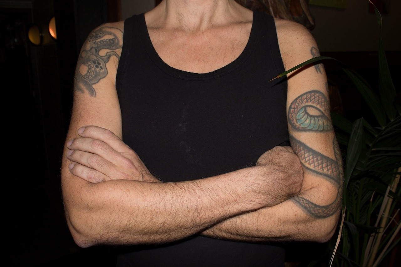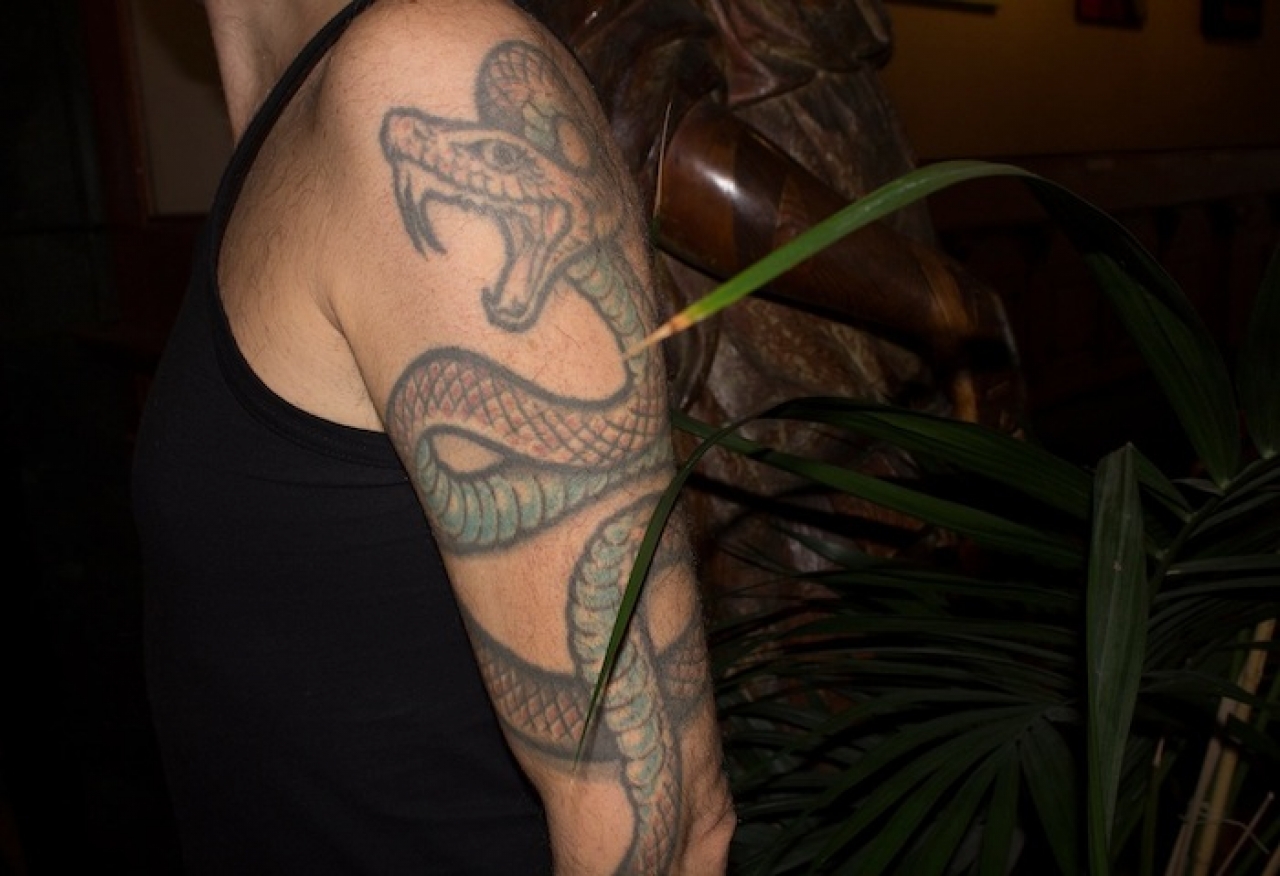 ‘Toen ik 26 jaar oud was en mijn eerste tatoeage liet zetten, kende ik nauwelijks kunstenaars die een inkttekening op hun lijf hadden. Hooguit rocksterren. Ik wilde een goede artiest vinden stuitte op Hanky Panky: beter bekend als Henk Schiffmacher -nog steeds een van de meest bekende tatoeëerders van Nederland. Ik wist dat hij een paar tatoeages bij Anthony Kiedis gezet had, dus dacht ik: als hij zo goed is, mag hij er ook een op mij zetten. Voor mijn eerste tatoeage liep ik al lange tijd rond met het verhaal van Laocoön en zijn zonen.’ De marmeren beeldengroep uit 40 – 20 v.Chr. vertelt het mythologische verhaal over Trojaanse priester Laocoön die samen met zijn twee zonen gewurgd wordt door twee slangen. De beeldengroep werd zo’n 600 jaar geleden gerestaureerd, omdat het verschillende onderdelen miste, waaronder de arm van Laocoön zelf. Volgens ‘berekeningen’ zou het beeld een uitgestrekte arm moeten hebben. Michelangelo zette in opdracht van de paus een nieuwe, uitgestrekte arm op het lichaam, ondanks dat hij van mening was dat de arm gebogen moest zijn. Midden in de 20e eeuw werd in Rome de originele arm van het beeld teruggevonden die inderdaad gebogen was. Ze verwijderden de gerestaureerde onderdelen en plakten de gevonden arm erop. ‘Voor mij staat deze gebeurtenis, en tevens voorstelling, symbool voor een irrationeel beeld. Ze dachten nogal gemakkelijk over het vinden van de ‘juiste’ vorm. Op mijn 26e was ik erg zoekende naar ‘de juiste vorm’, terwijl ik tegenwoordig van mening ben dat er geen goede vorm aanwezig is en je deze zelf moet verzinnen. Voor mij staat binnen deze gedachte de verloren, door een slang, verstrengelde arm symbool.” Dirk Jan ging naar Henk Schiffmacher toe met het vage idee dat hij een slang om zijn bovenarm wilde. “Destijds sloeg je niet zomaar een laptop open waarop je gemakkelijk een afbeelding van een slang kon vinden. Daarom trok Henk de encyclopedie uit de kast en bekeek daarin verschillende afbeeldingen van slangen. Vervolgens begon hij met stiften uit de losse pols een slang op mijn bovenarm te schetsen. Een paar pogingen -en gescheld van Schiffmacher- later stond de tekening van de slang erop en kon de naald erin.