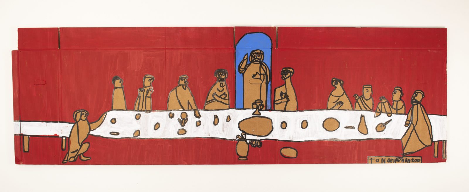 We lopen naar het eerste werk van For the Love of Art. Op een enorme uitgeklapte kartonnen doos schilderde Ton de Haan in 2010 zijn versie van het Laatste Avondmaal, met cartooneske apostelen voor een knalrode achtergrond, en Jezus voor een hemelsblauwe poort. De onvermengde kleuren knallen van het karton. Rood! Blauw! Kroon: ‘Dit vind ik gelijk geweldig. Het is zo compromisloos.’