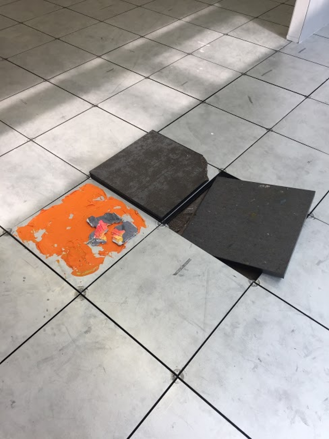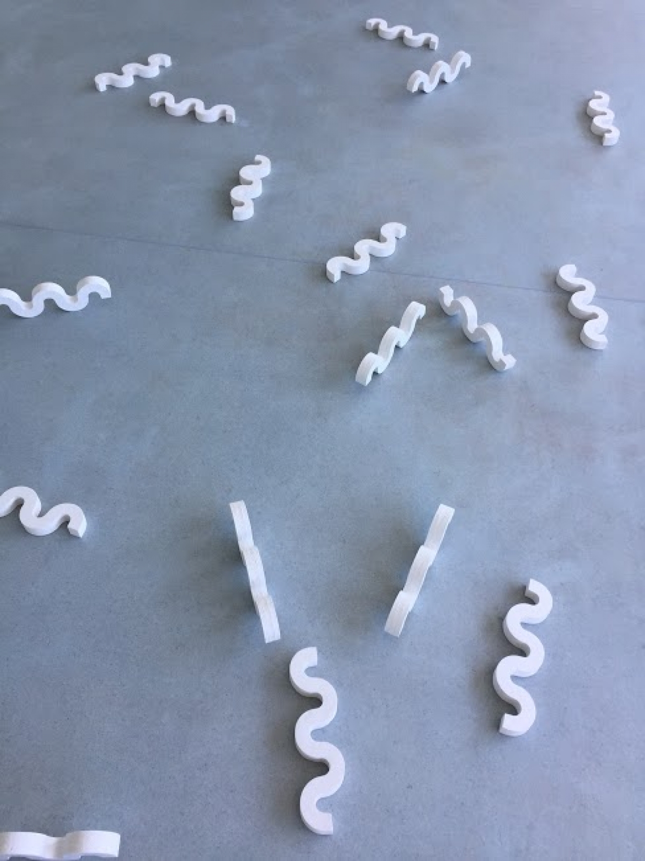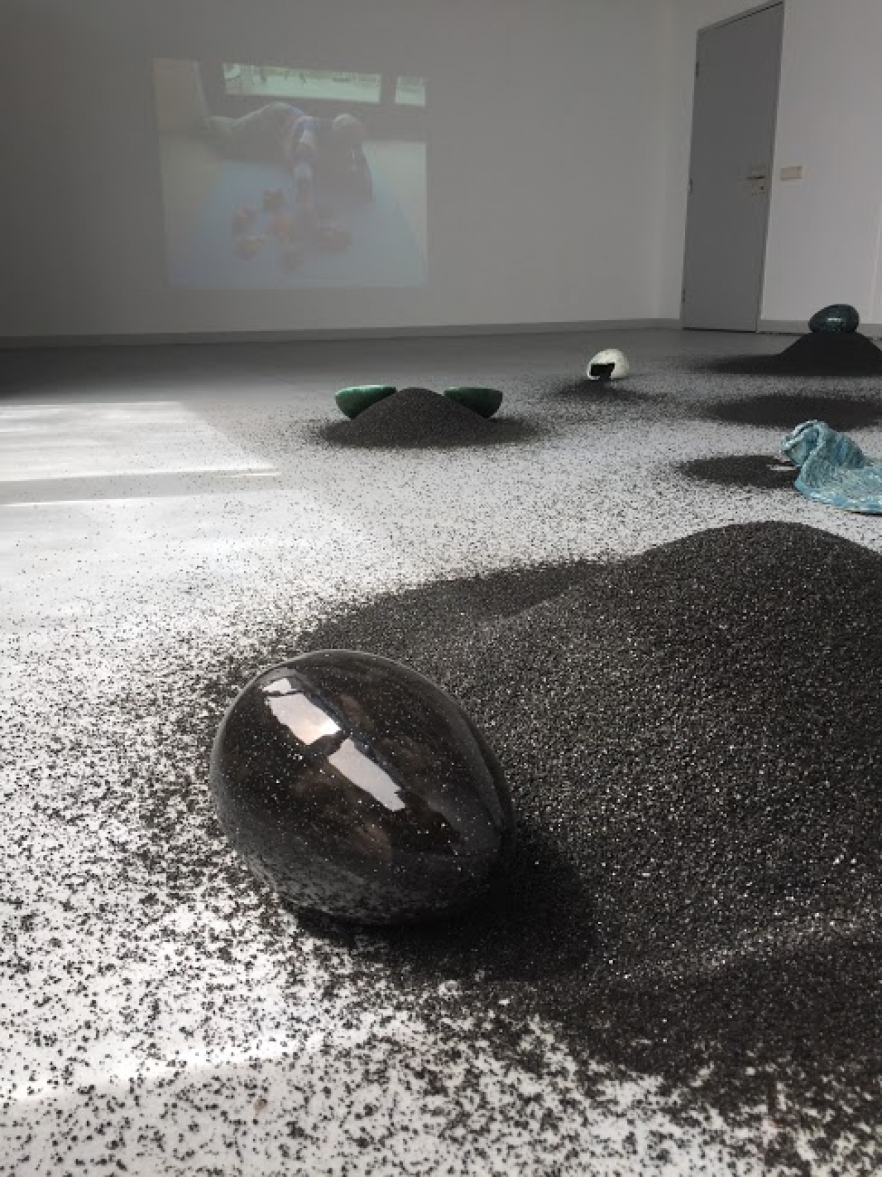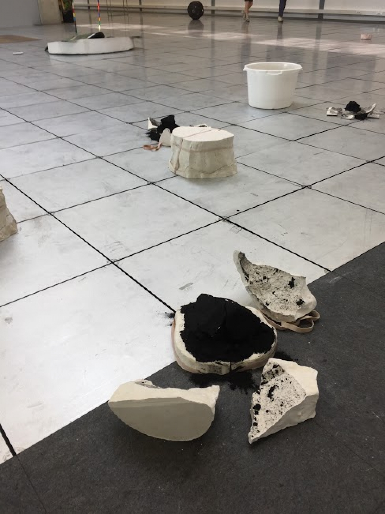 De op de grond verspreide mallen zijn uiteen gebarsten of worden wanhopig bij elkaar gehouden door elastieken. Het steenkoolgruis – die door eeuwen van tijd zou kunnen verstenen – ligt verspreid langs dat wat zijn vorm had moeten zijn. Mirthe van Breemen bevraagd met haar werk het ongrijpbare en kwetsbare moment van transformatie, ‘het moment waarop iets verandert zien we haast nooit, we zien enkel het ‘voor’ en het ‘na’ ’. Zo komt de titel van de tentoonstelling ook nog specifiek terug in deze presentatie.