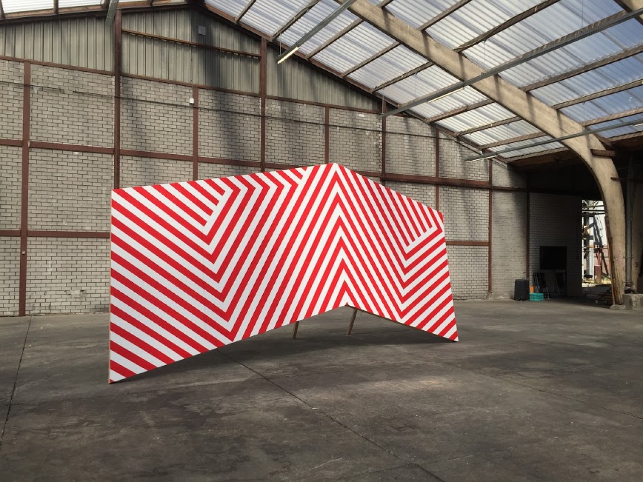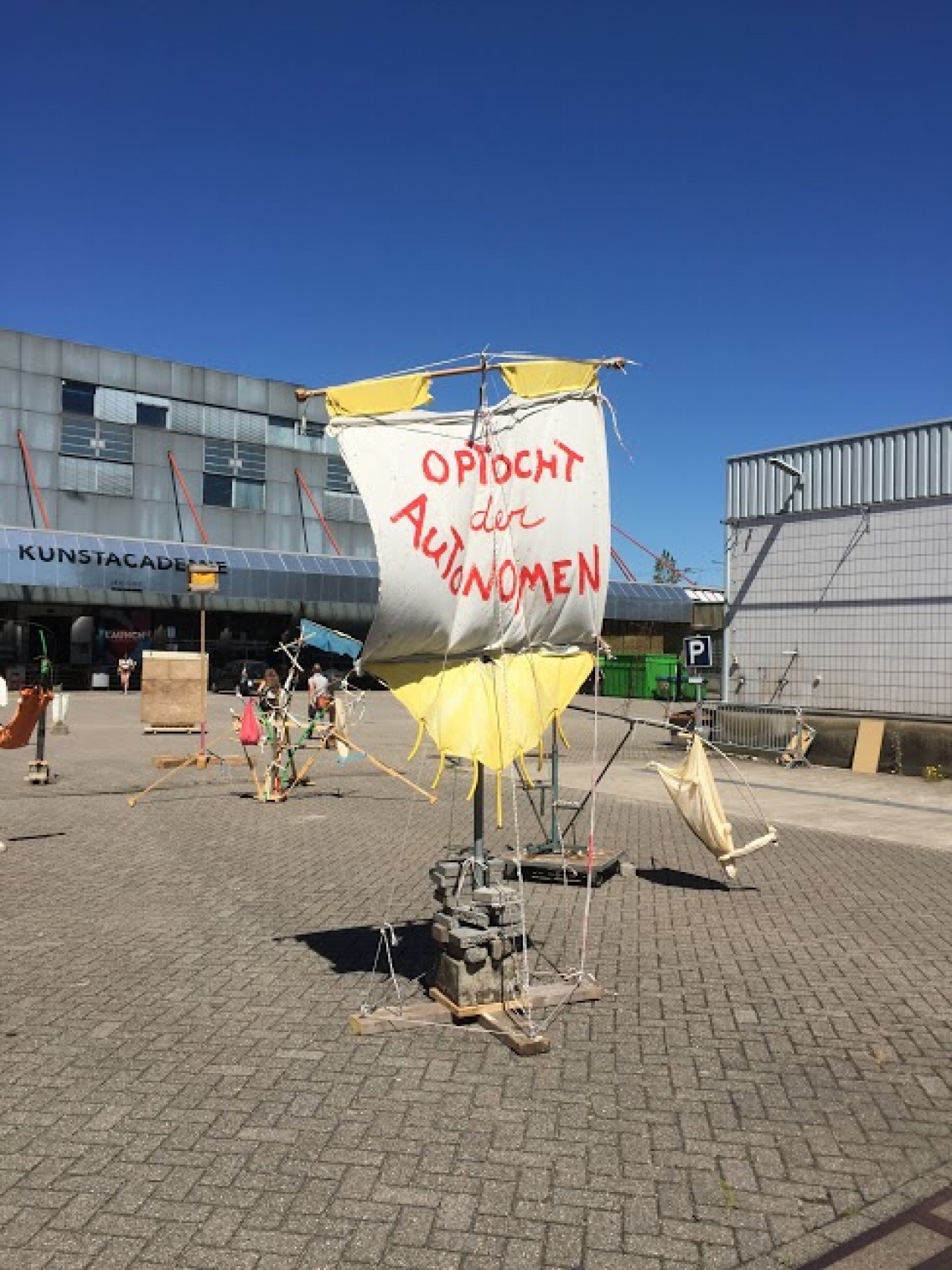 ‘De Optocht der Autonomen’ is een reizende installatie van Wessel Verrijt. Houten planken, (beschilderde) doeken, stoeptegels en andere primitieve bouwmaterialen worden groots opgebouwd en uitgestald voor presentatie, waarna het met eenzelfde gemak weer wordt afgebroken. Op film is te zien hoe hij op zijn fietsje het gevaarte in beweging brengt, op weg naar een nieuwe bestemming. Een video met scherpe close-ups afgewisseld door handheld videobeelden romantiseert het verhaal nog een tikkeltje meer – samen trouwens met een boekje vol foto’s, brieven en handgeschreven ondertitels. Voor nu is zijn werk voor vijf dagen verbonden aan de parkeerplaats, waar de auto’s er net langs kunnen om in en uit te rijden, maar volgende week, volgende maand of ergens de komende jaren neemt zijn optocht weer andere vormen aan.