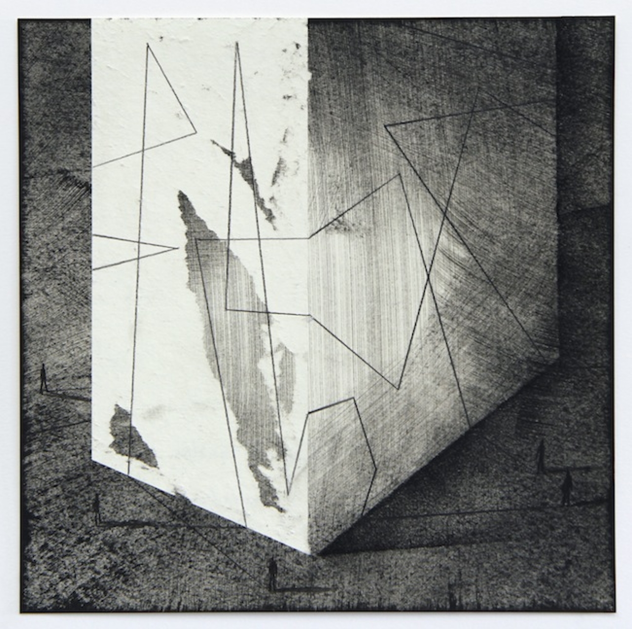 Dat wezenlijke is binnen haar tekenen terug te vinden in hoe ze zich verhoudt tot objecten en lichamen die een meetkundige aard hebben en die altijd enigszins uit het lood zijn gebracht. Het zijn bouwsels die geen functionaliteit laten zien en die als zelfstandige elementen als dode zielen in de tekeningen hun plaats krijgen. Het zijn vaak scherpe, hoekige vormen, veelvlakken en vouwpatronen die als een onvatbare architectuur zich verhouden tot menselijke figuren. Die mensen hebben een schaalgrootte die de hele tekening en de abstracte objecten in het bijzonder bevraagt. Je zoekt binnen de tekening naar een verhouding die je er zelf mee kunt aangaan en het is niet eenvoudig daarin te slagen. Dat kost enige moeite. Doordat Lenneke van der Goot beschikt over een overtuigende tekenhand slaagt ze erin je mee te nemen in dat kijkproces. Er zit een gemak in het werk dat verhult met hoeveel moeite het tot stand komt. Zeker als ze driedimensionaal op grote schaal in de publieke ruimte werkt of binnen kunstruimtes grotere installaties bouwt, valt het op hoe vaardig ze vormproblemen oplost. Daardoor is haar werk ook inhoudelijk meteen overtuigend omdat ze de techniek waarmee ze haar werk uitvoert, gelijkschakelt aan wat ze daarmee laat zien. In haar werkwijze moet ze voortdurend een weerstand in zichzelf overwinnen. Het tekengemak mag niet de overhand krijgen op de weerbarstigheid van het onderwerp. Tegelijkertijd is de tekenlust onontbeerlijk voor de kwaliteit van het werk. Daarom varieert ze voortdurend in middelen en materiaalgebruik. Ze probeert beetje bij beetje binnen bereik te brengen wat daar voortdurend net buiten ligt. Door de uitbreiding van het arsenaal en de mogelijkheden groeit haar kunstenaarschap zowel ambachtelijk als ideematig.