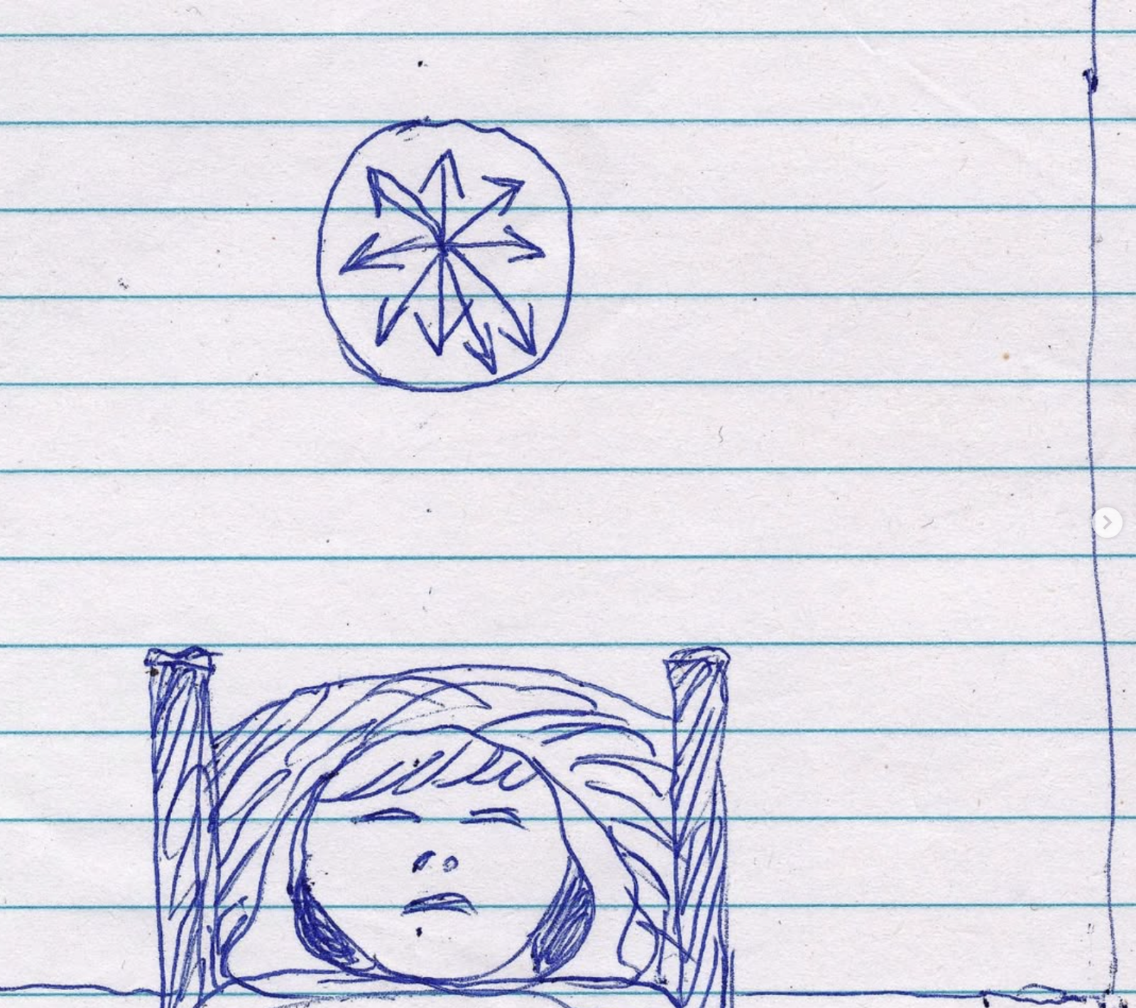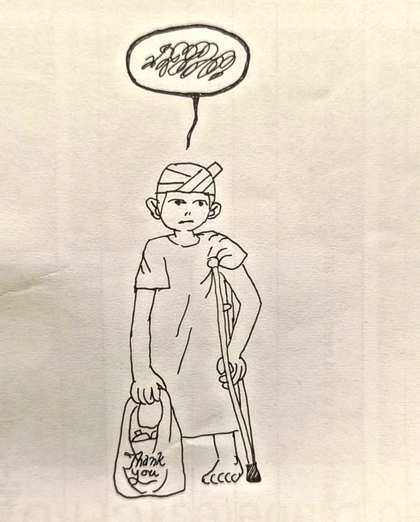 Er is meer te zien op de tekening van Ionatán: een ziekenhuiskamer, een mens, alleen, liggend op bed, starend naar het plafond, bekeken vanaf de onderkant van de voeten. Als kijker lig je bijna tegenover deze persoon in dit kille vertrek. Maar niet helemaal. De figuur blijft op afstand, alleen.