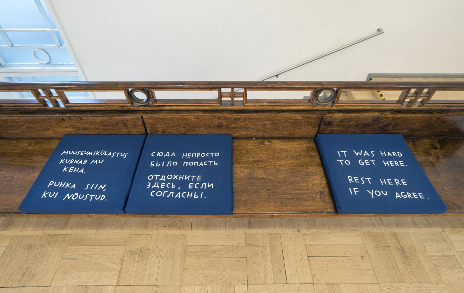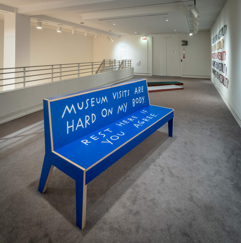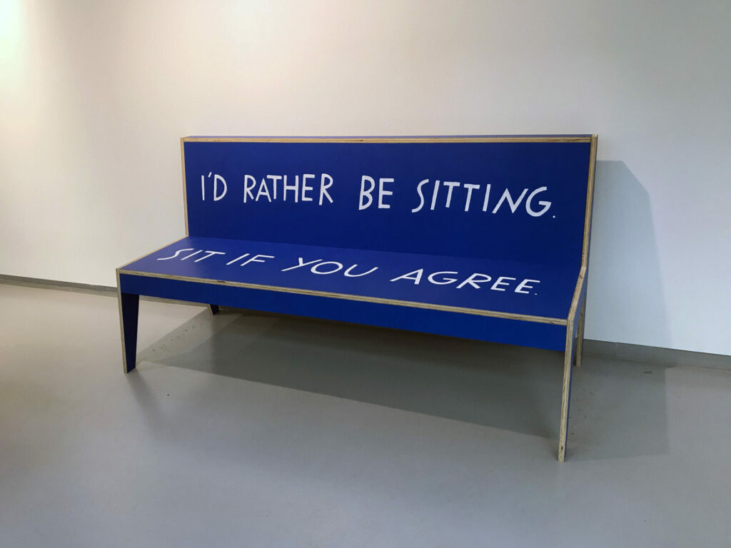 “It was hard to get here, rest here if you agree” staat er in grote kapitalen op de donkerblauwe bank, gemaakt door kunstenaar Finnegan Shannon. Shannon belicht met directe toon en felle kleuren de tekortkomingen in toegankelijkheid van de openbare ruimte. Zachte materialen als fluweel komen regelmatig terug. Maar de boodschap is direct en klinkklaar: vergeet ons niet, hier in deze ruimte bevinden zich zonder dat het voor de omgeving altijd zichtbaar is, mensen voor wie het geen vanzelfsprekendheid is dat ze er zijn.