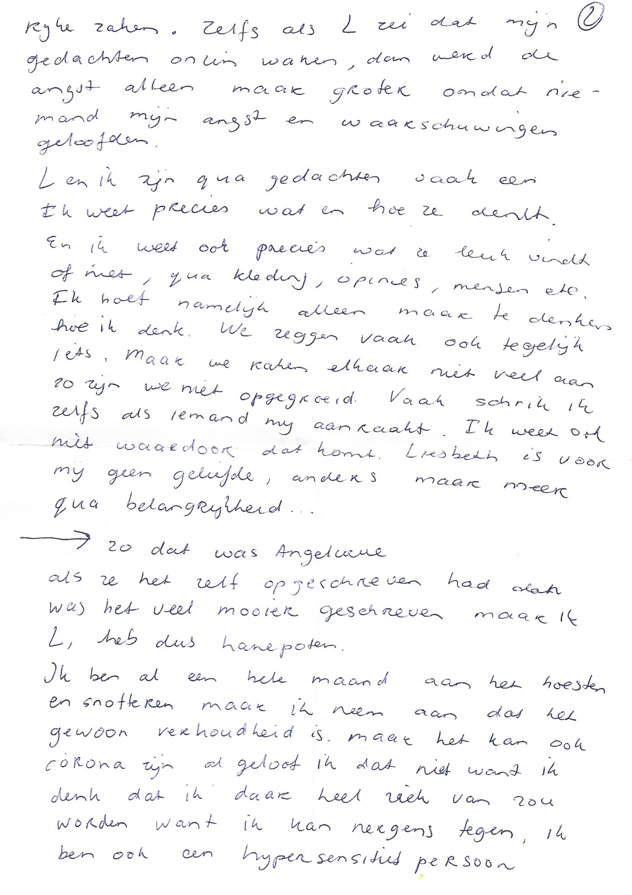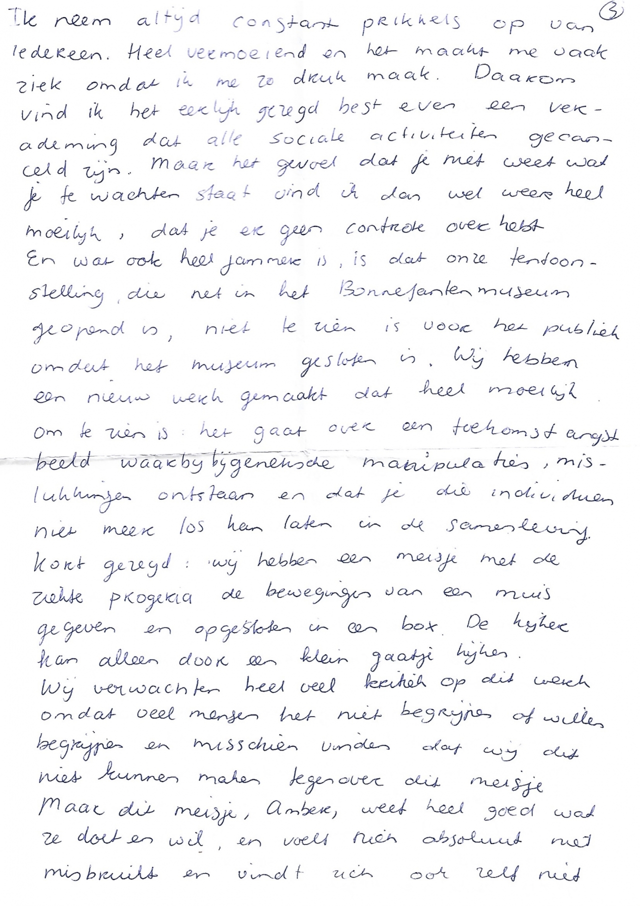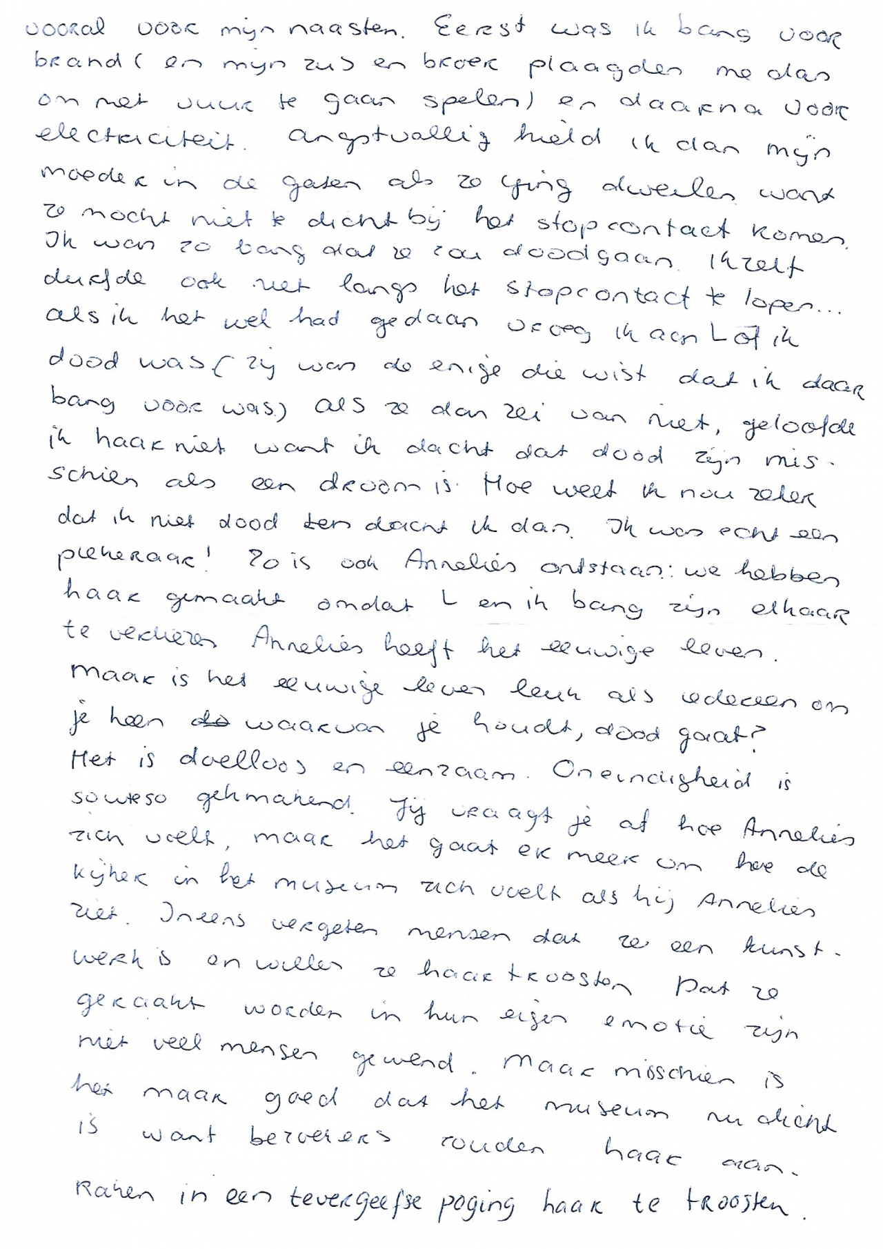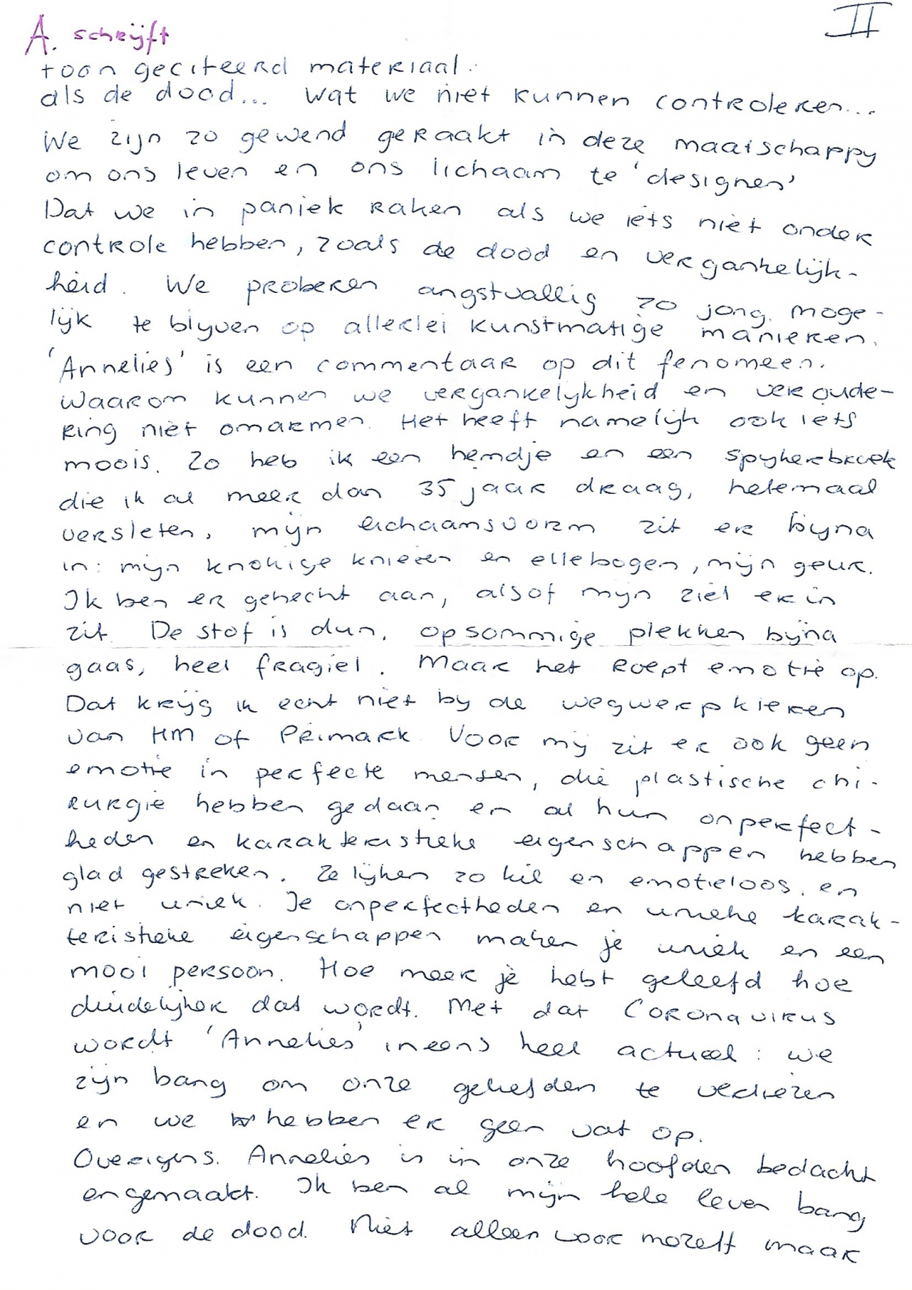 Ik vrees dat ik net als de mensen in het museum vergeten ben dat Annelies een kunstwerk is. Al vind ik het zelf ook wel fijn om me op haar te richten. Al mijn angsten laaien op door de Coronacrisis. Door me zorgen te maken om Annelies kan ik waar ik echt bang voor ben buiten huis houden. Het is afleiding op een veilige manier. Al geloof ik ook dat alles wat bedacht is ook echt is. Ook al hebben jullie haar bedacht en gemaakt, ze bestaat wel. Of in elk geval ik wil dat ze bestaat, dat ik mijn eigen emoties op haar mag projecteren. Dat geeft me de illusie van rust. Zoals A. zegt we raken nu collectief de controle kwijt door de crisis. Misschien kunnen we als geheel leren van de kleren van A. Ik heb zelf ook een T-shirt dat ik al heb sinds ik 14 ben, de boord op de nek is helemaal uitgerekt, een stuk van de stof is log gekomen. Toch draag ik dat shirt nog steeds het liefste.