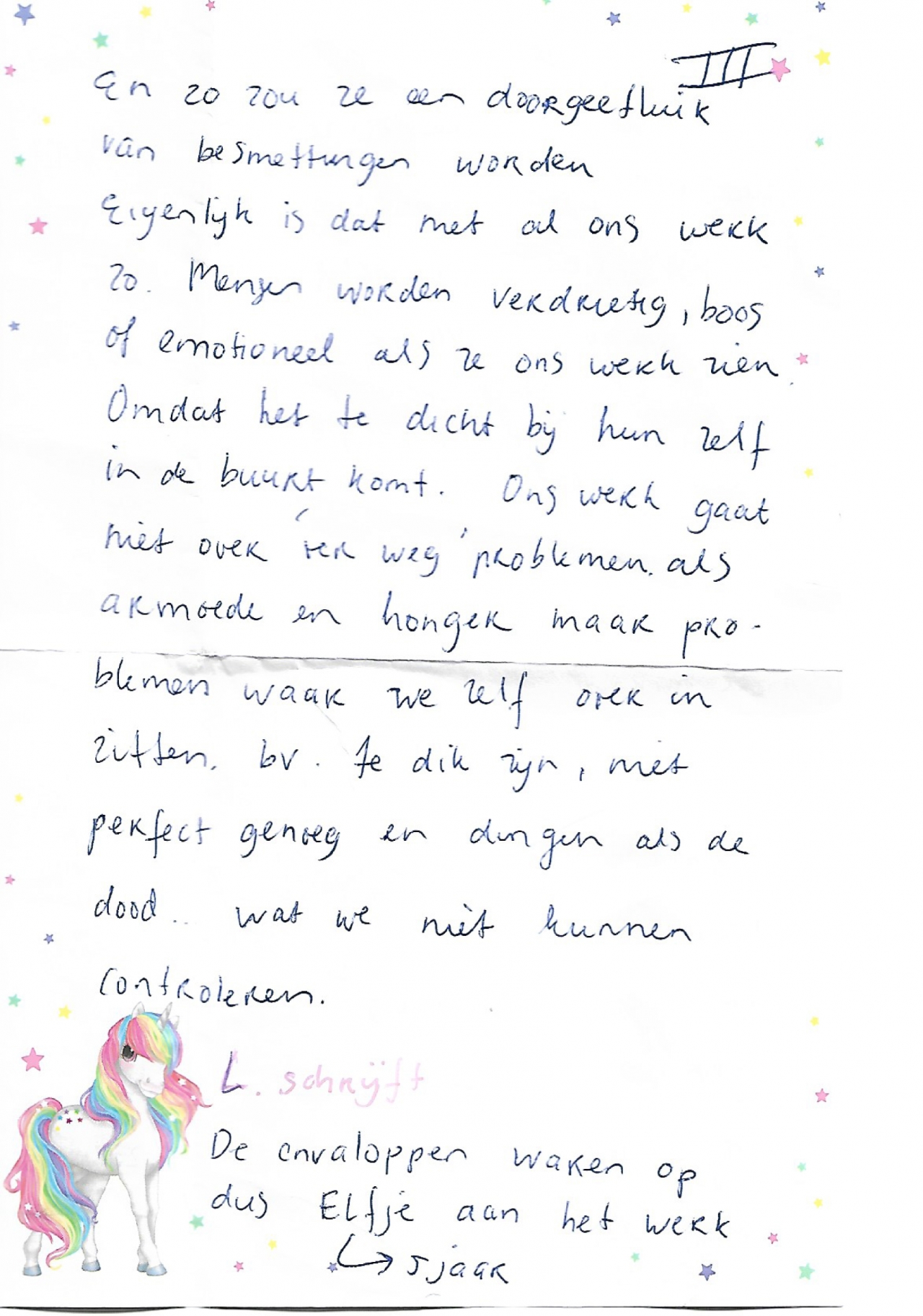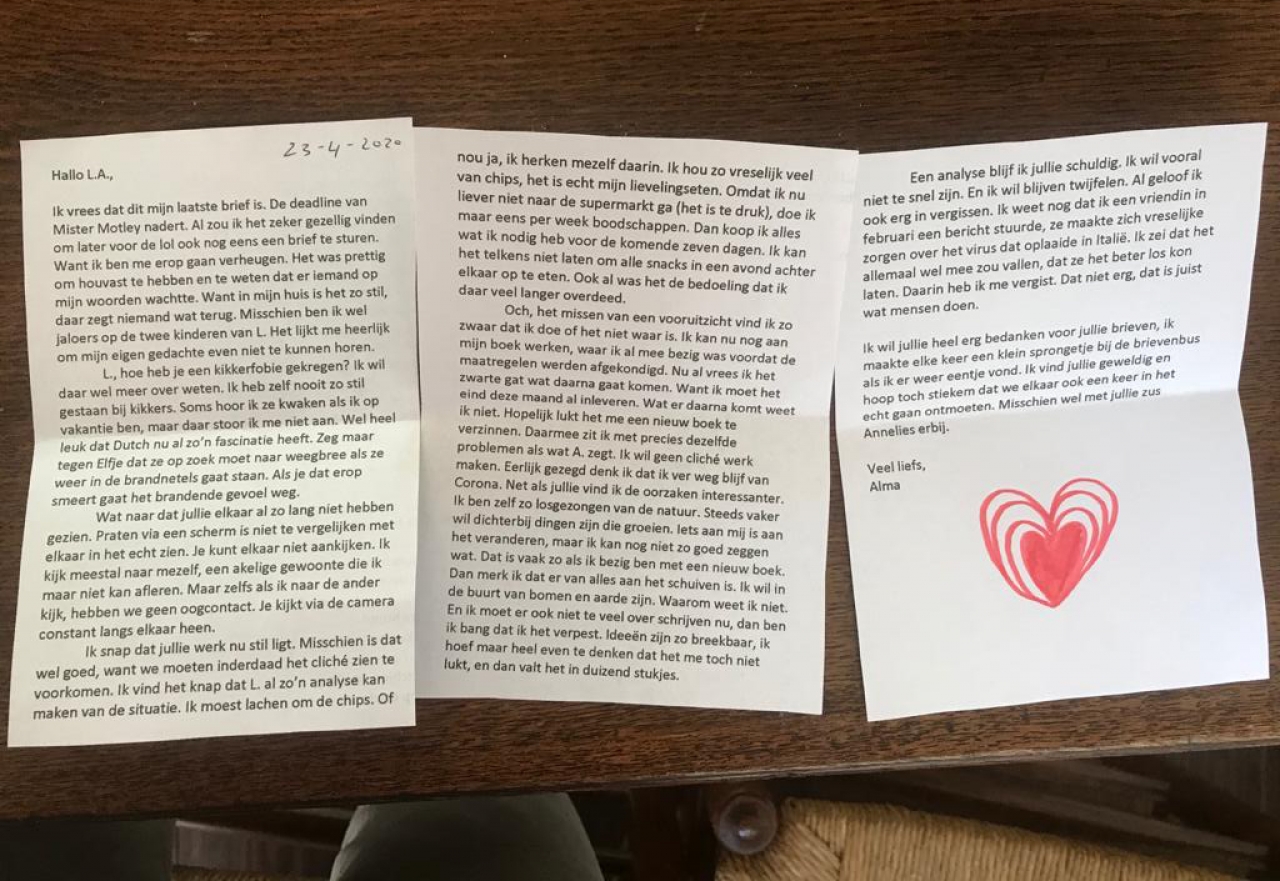 Sorry dat mijn brief zo persoonlijk is, ik merk dat ik mezelf slecht kan afremmen. Als jullie het liever ergens anders over hebben, is dat natuurlijk ook goed. Ik weet niet zo goed waarom maar jullie lijken me lief. Ik ga vandaag voor het eerst naar buiten om deze brief te posten. Geen angst mijn symptomen zijn al sinds vrijdag over. Maar toch ga ik heel vroeg in de ochtend als iedereen nog slaapt, zodat ik niemand kan besmetten. Met wat dit ook is. Misschien lach ik om een paar maanden heel hard om deze brief, misschien stelde ik me vreselijk aan, misschien niet. Ik hoop op de eerste twee. Schrijven jullie me snel? Dan schrijf ik ook weer snel. Ook al ken ik jullie niet, ben ik benieuwd hoe het met jullie gaat.