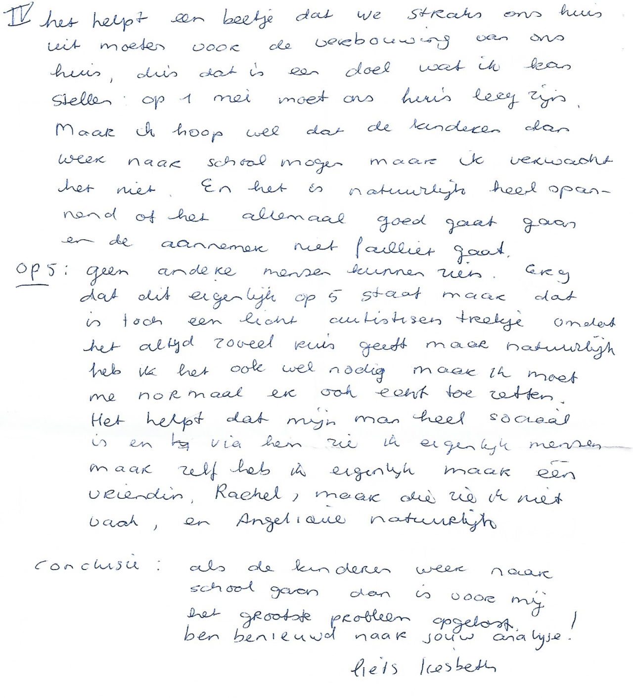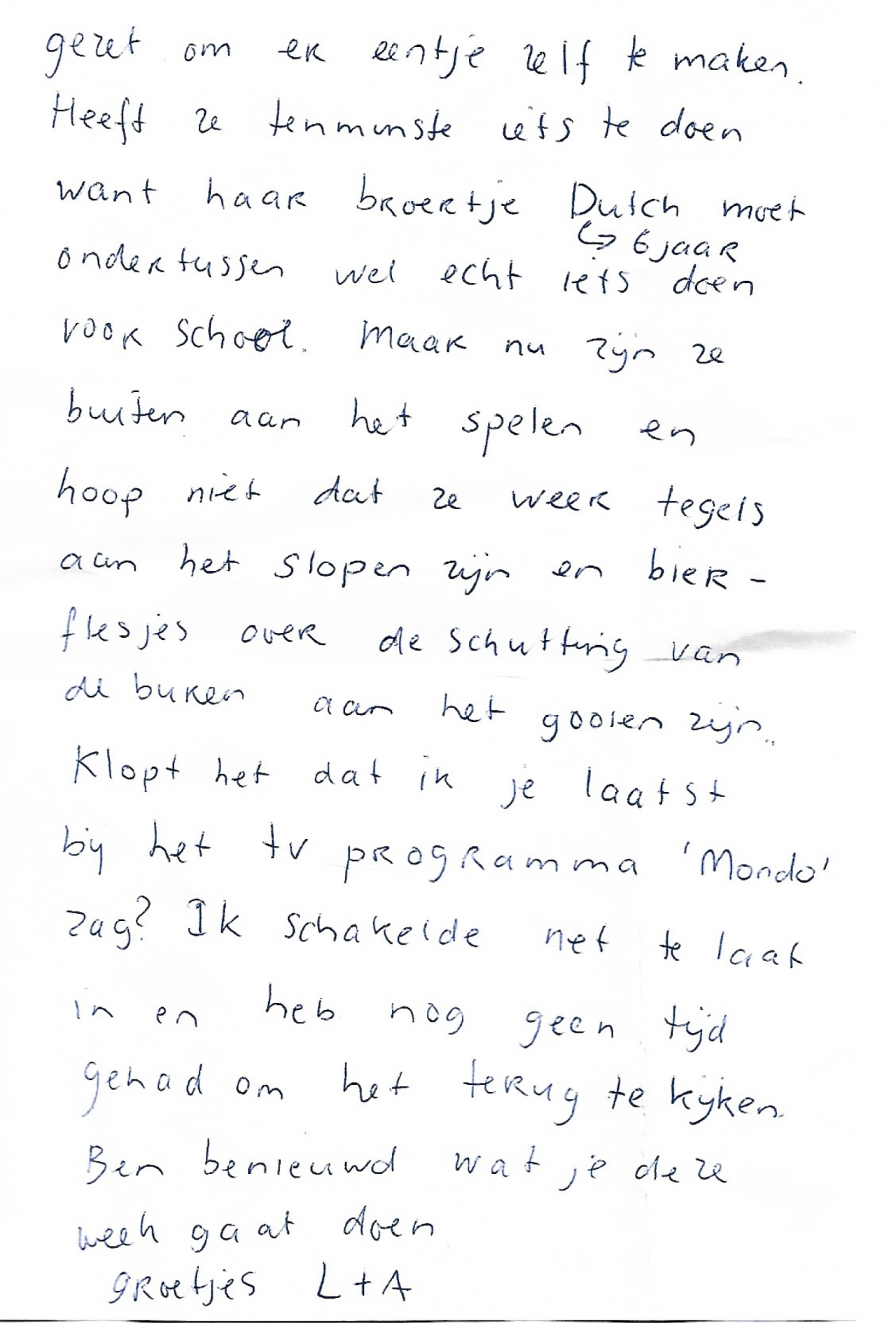 Ik wil jullie heel erg bedanken voor jullie brieven, ik maakte elke keer een klein sprongetje bij de brievenbus als ik er weer eentje vond. Ik vind jullie geweldig en hoop toch stiekem dat we elkaar ook een keer in het echt gaan ontmoeten. Misschien wel met jullie zus Annelies erbij.