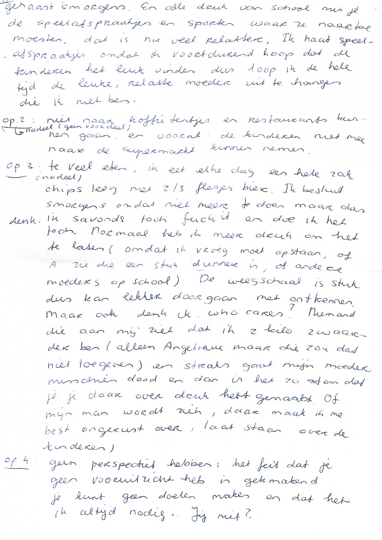 Och, ik vergeet steeds dat ik mezelf natuurlijk moet introduceren. Mijn naam is Alma Mathijsen. Ik schrijf boeken en soms een stuk voor de krant. Mijn laatste boek heet Ik wil geen hond zijn en gaat over een vrouw die langzaam in een hond veranderd. Ze wil terug naar haar ex-geliefde dus sluit ze zich aan bij een traject waarin je langzaam kunt transformeren tot een hond. Uiteindelijk word je dan terug geplaatst bij je ex-geliefde en kan zoveel van hem of haar houden als hond zijnde. Ik vind het nu wel erg moeilijk om te schrijven. Mijn concentratie is bijna helemaal verdwenen, al probeer ik wel wat notities te maken.