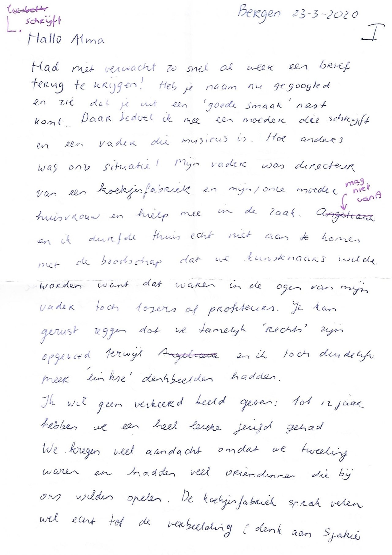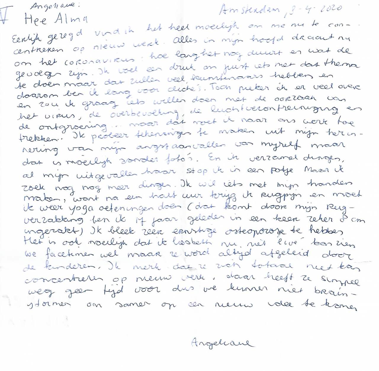 Dank voor jullie brief, het maakt me blij. En elke keer is ie ook zo mooi versierd! Dank Elfje maar van mij. Sorry dat ik zo laat iets terug stuur, ik vond het moeilijk om me ergens toe te zetten in de afgelopen week. Ik raak gewend aan dit nieuwe leven, wat prettig is voor het gemoed, maar het maakt me erg loom. Ik heb geen zin werk te maken, al moet ik aan een nieuw boek schrijven dat al in september uit gaat komen. Lukt het jullie om nog werk te maken? Zien jullie elkaar? En als jullie elkaar niet zien, missen jullie elkaar dan? Ik was al langere tijd bezig met een boek, of eigenlijk mijn memoires, al klinkt dat in het Nederlands een beetje gek. In het Engels klinkt het beter: memoir. Dat is wat het is. Het speelt zich allemaal af in Italië, waar mijn ouders 40 jaar geleden samen een ruïne kochten voor 4000 gulden. Jaar na jaar bouwden ze dat op, en brachten mij mee als baby. Sindsdien ben ik daar elke zomer een paar maanden geweest. Mijn vader overleed toen ik negen jaar was, ik beschrijf onze laatste zomer met hem en onze eerste zomer zonder hem. Vanaf toen waren mijn moeder en ik alleen. Er is daar zoveel gebeurd, ik vertel het allemaal in het boek. Nu ben ik vreselijk aan het twijfelen of ik het heden ook moet opnemen in het verhaal. Moet ik vertellen dat ik 2020 waarschijnlijk niet daar zal komen? Of zijn we dit alles al vergeten als het boek uitkomt? Betrekken jullie deze crisis in jullie werk? Ik weet nog niet zo goed hoe we daar als kunstenaars mee om moeten gaan. Jullie wel? Wordt dit een thema? Ik zag dat Arthur Japin op Twitter zei dat we dit over tien jaar vergeten zijn. Ergens hoop ik dat hij gelijk heeft, al twijfel ik.