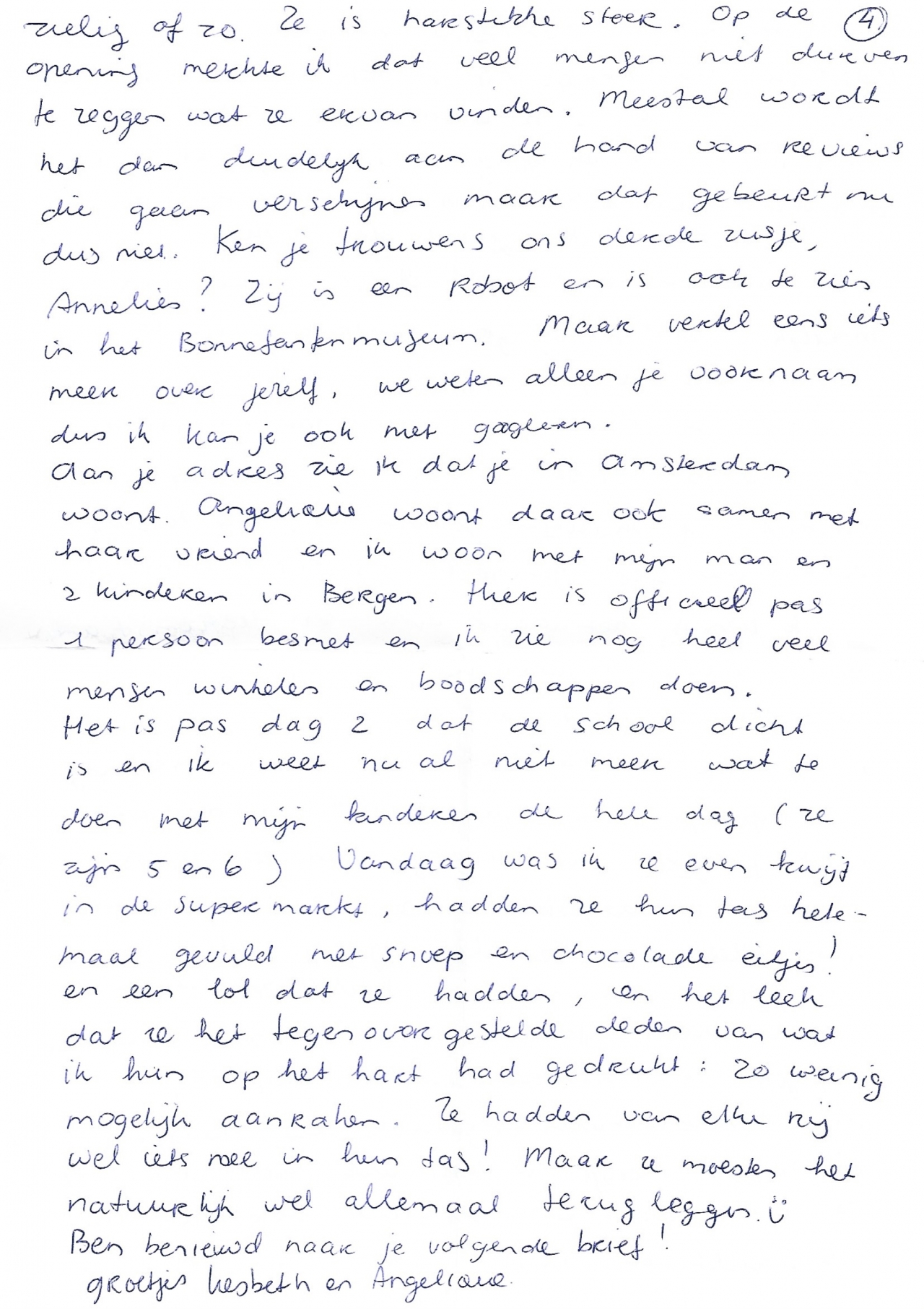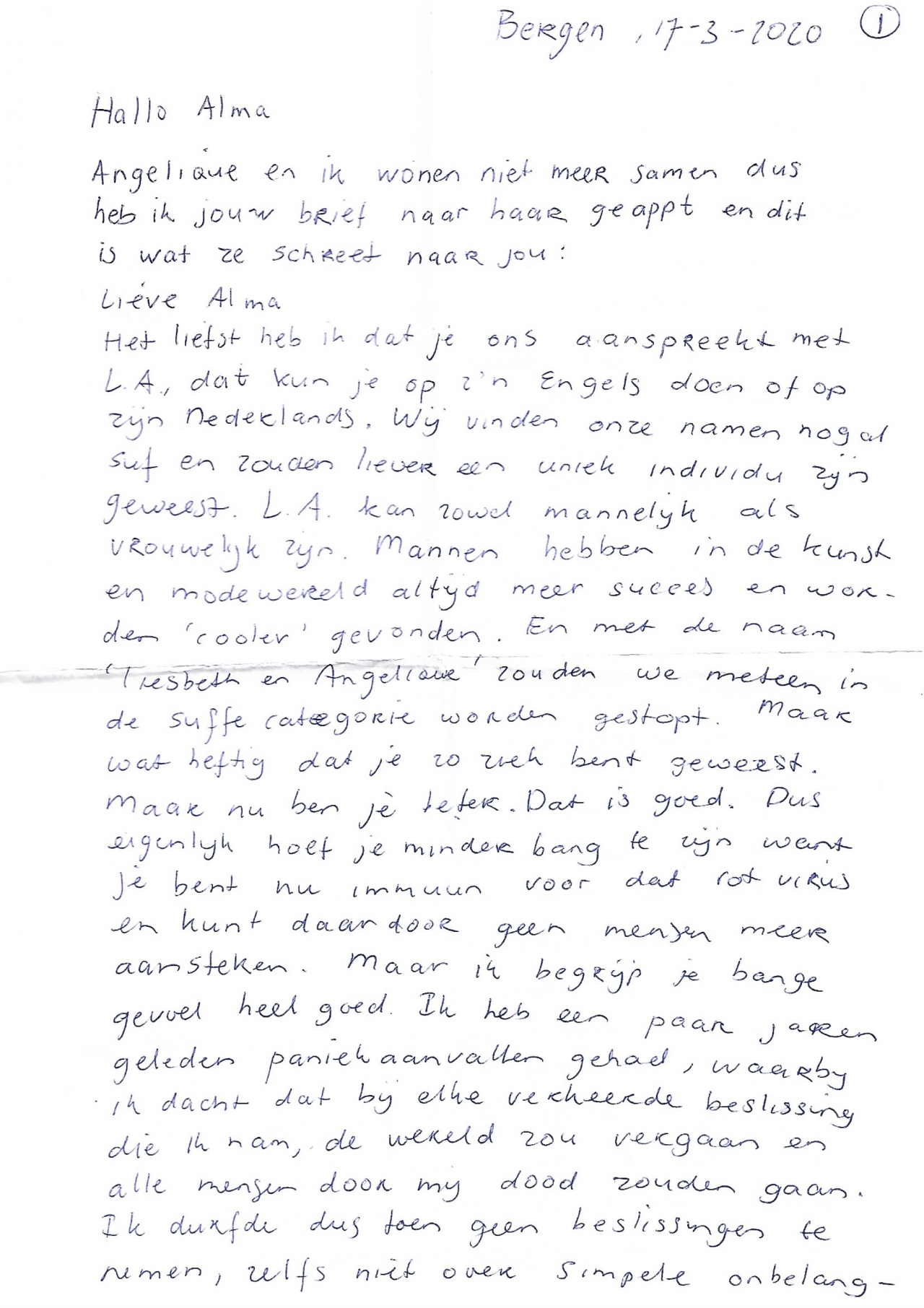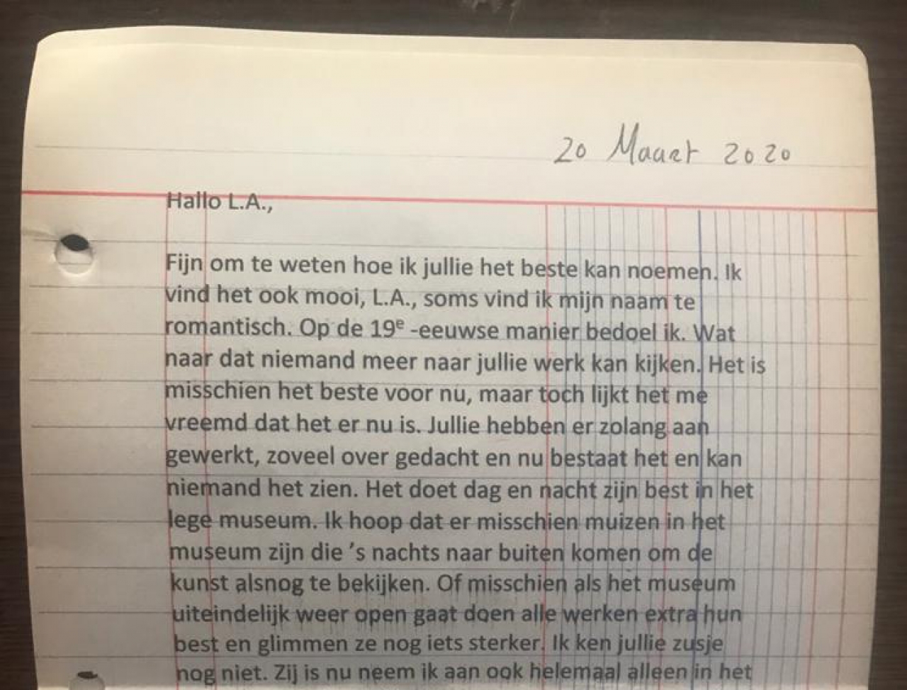Fijn om te weten hoe ik jullie het beste kan noemen. Ik vind het ook mooi, L.A., soms vind ik mijn naam te romantisch. Op de 19e -eeuwse manier bedoel ik. Wat naar dat niemand meer naar jullie werk kan kijken. Het is misschien het beste voor nu, maar toch lijkt het me vreemd dat het er nu is. Jullie hebben er zolang aan gewerkt, zoveel over gedacht en nu bestaat het en kan niemand het zien. Het doet dag en nacht zijn best in het lege museum. Ik hoop dat er misschien muizen in het museum zijn die ’s nachts naar buiten komen om de kunst alsnog te bekijken. Of misschien als het museum uiteindelijk weer open gaat doen alle werken extra hun best en glimmen ze nog iets sterker. Ik ken jullie zusje nog niet. Zij is nu neem ik aan ook helemaal alleen in het museum. Denken jullie dat ze eenzaam is? Mist ze jullie? Zou ze vrienden gemaakt hebben? Is ze bang om het virus te krijgen? Of kan dat helemaal niet? Ik vraag me zo af wat er gebeurt met kunst die niet bekeken wordt. Misschien willen jullie deze boodschap voor de zekerheid aan Annelies overbrengen: