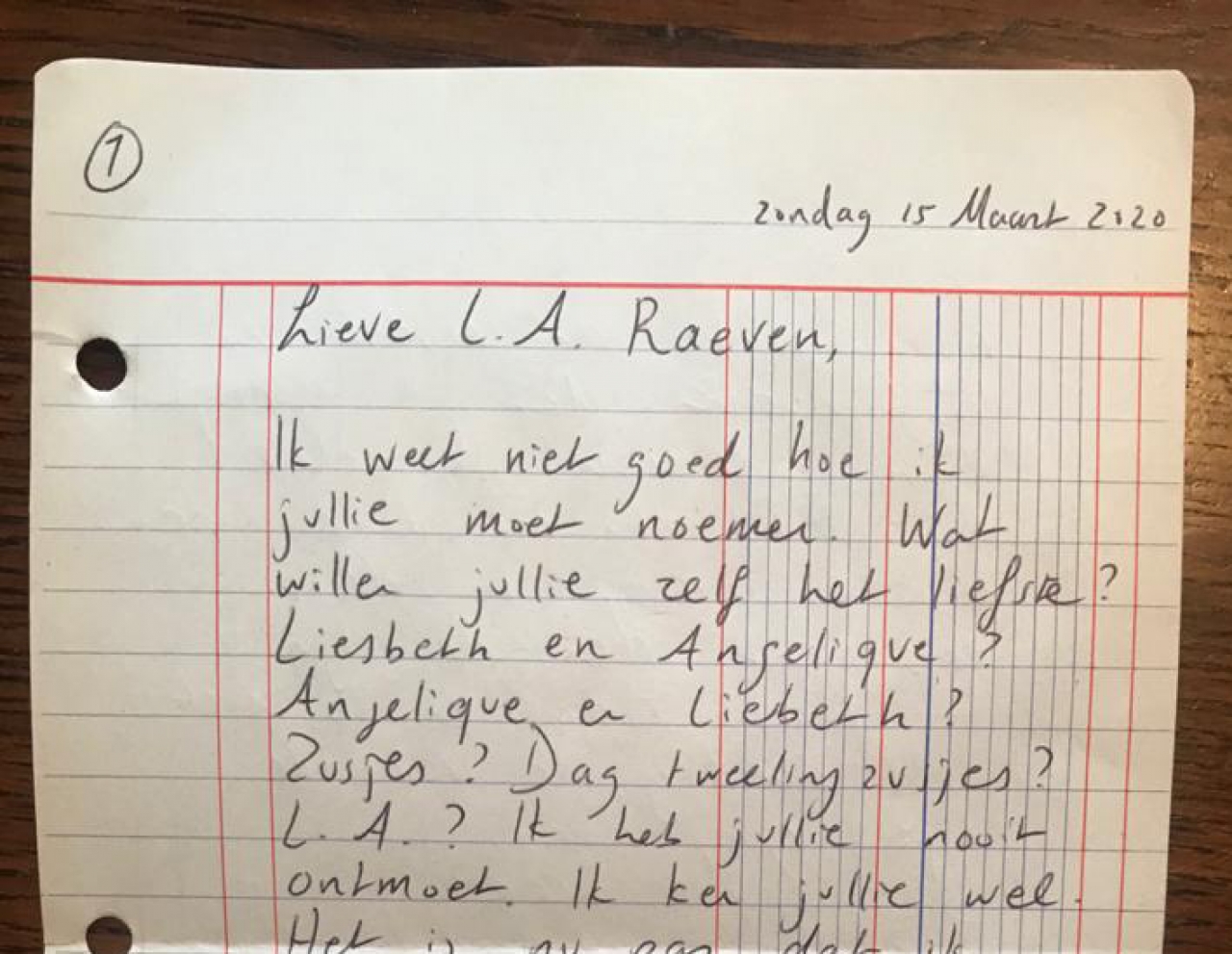 Ik weet niet goed hoe ik jullie moet noemen. Wat willen jullie zelf het liefste? Liesbeth en Angelique? Angelique en Liesbeth? Zusjes? Dag tweelingzusjes? L.A.? Ik heb jullie nooit ontmoet. Ik ken jullie wel. Het is nu pas dat ik begrijp waar L.A. voor staat, stom eigenlijk. Want ik kende jullie namen al.