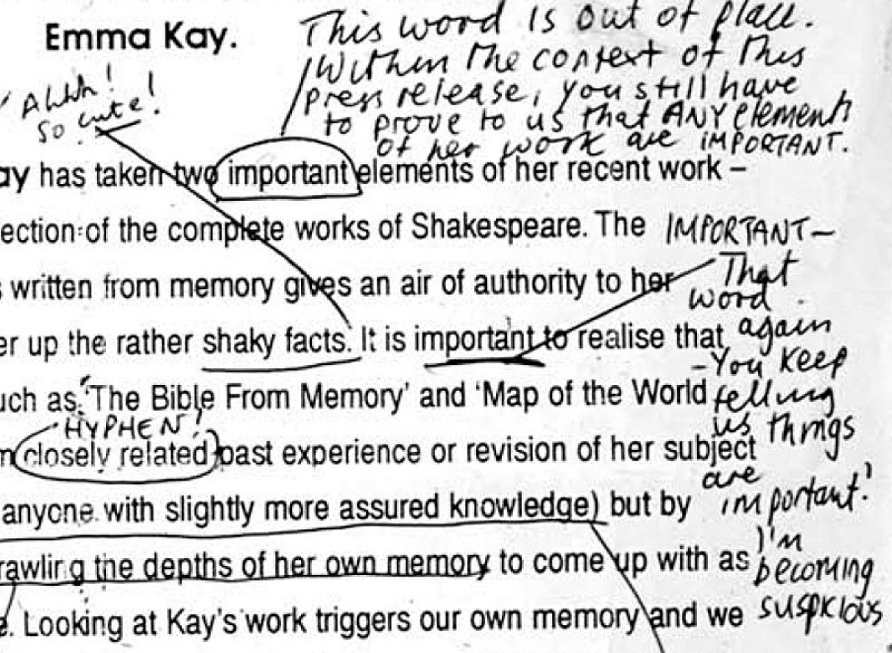 De objecten worden reflectie van wat mensen graag willen zijn. Persoonlijkheid en bezit vallen samen: het interieur en de jurk die je draagt laten zien wie je bent. Het verhaal werpt, net als veel beeldende kunst uit die tijd, een kritische blik op de verworvenheden van de welvaart. de herinnering aan dit boek kwam bij me boven bij het zien van een werk van Emma Kay, onlangs in de tentoonstelling Reconstructions in SMART Project Space in Amsterdam. Kay analyseert een aantal literaire werken door alle daarin voorkomende voorwerpen te isoleren en in volgorde van verschijnen in een lijst onder te brengen. De typografie is steeds aangepast zodat elke lijst, of hij nu kort is of lang, op eenzelfde formaat papier past. Het werk van Kay doet een direct beroep op de verbeelding: de toeschouwer zou aan de hand van de lijsten zijn eigen verhaal kunnen bouwen. Maar de gegevens zijn ook op te vatten als een sociologisch onderzoek. Dit aspect van Kays werk komt heel dicht in de buurt van Perecs roman, alleen gaat Perecs boek over de dingen en Kay over de representatie daarvan in een boek.